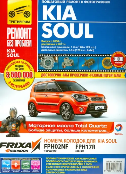Руководство по ремонту Kia Soul, а также инструкция по эксплуатации и техническому обслуживанию, устройство Киа Соул с 2008 г выпуска (включая рестайлинг 2011 г), оборудованных бензиновыми двигателями рабочим объемом 1,6 л и дизельными двигателями объемом 1,6 л. Настоящее пособие по ремонту Kia Soul выгодно отличается не только множеством фотографий, иллюстрирующих каждый этап ремонтных и регулировочных работ, но и доступностью описаний всех процедур. Благодаря пошаговым инструкциям все процедуры техобслуживания и несложного ремонта доступны даже новичку. А понятные пиктограммы оценки уровня сложности операции по ремонту, нужного количества человек для ее проведения, рекомендованного места выполнения и ориентировочного количества времени, требуемого для проведения операции помогут точно рассчитать силы и решить, браться ли за самостоятельный ремонт или лучше обратиться к специалисту. Разработанная авторами издания система позволит безошибочно определить характер неисправности для последующей оценки затратности ее устранения. Если вы стремитесь к том, чтобы ваш автомобиль прослужил вам как можно дольше и не доставлял лишней головной боли, рекомендуем внимательно ознакомится с главой Инструкция по эксплуатации Киа Соул. В ней найдутся данные не только о правилах эксплуатации этого авто, но и об особенностях модели, специфике вождения в разных условиях, словом, все "фишки", которые помогут максимально быстро и комфортно освоиться в автомашине. Техническое обслуживание приводит подробное описание всех процедур и указания по периодичности их проведения. Также книга содержит полные технические характеристики Кия Соул, контрольные размеры и полные электросхемы Kia Soul. Не бросит издание и в пути: обстоятельно расскажет, как подготовиться к дороге, что делать в той или иной ситуации. А устранение неисправностей в пути оформлено в виде самостоятельной главы, что значительно упрощает поиск информации в чрезвычайной ситуации. Стоит отметить, что все фотографии мануала сделаны в процессе полной разборки и сборки автомобиля Kia Soul профессиональными автомеханиками, и это означает, что вы можете полностью полагаться на данные книги, не сомневаясь в их достоверности. Кроме того, в руководство вошли и рекомендации команды профессионалов, которая работала с этими автомобилями. Инструкция по ремонту Kia Soul ориентирована в первую очередь на владельцев автомобилей, которые стремятся поддерживать свой авто в наилучшем состоянии и на тех, кто заинтересован в самостоятельном обслуживании и ремонте машины. Однако издание рекомендовано и сотрудникам СТО и авторемонтных мастерских, ведь с его помощью можно значительно снизить время- и трудозатраты, а ремонтные работы проводить с учетом специфики автомобиля. Редакторы-составители: Михайлов А. В. , Несмачных В. В.