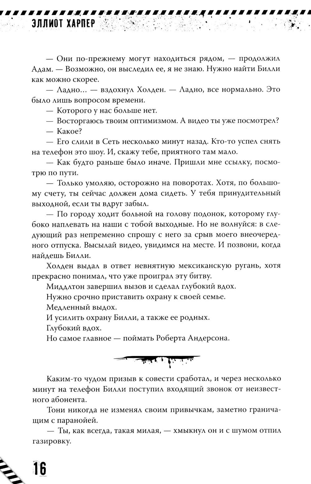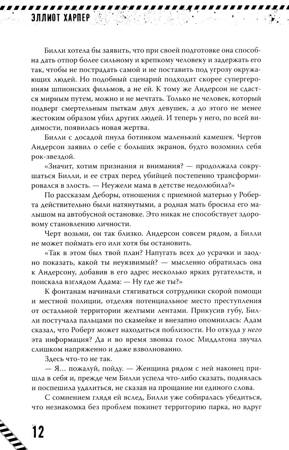 СОДЕРЖИТ ИНФОРМАЦИЮ О НАРКОТИЧЕСКИХ ИЛИ ПСИХОТРОПНЫХ ВЕЩЕСТВАХ, УПОТРЕБЛЕНИЕ КОТОРЫХ ОПАСНО ДЛЯ ЗДОРОВЬЯ. ИХ НЕЗАКОННЫЙ ОБОРОТ ВЛЕЧЕТ УГОЛОВНУЮ ОТВЕТСТВЕННОСТЬ. Фонтаны Миллениум-парка окрасились кровью: очередная жертва была убита с изощренной жестокостью на глазах у всего города. Билли Сэлинджер и Адам Миддлтон понимают: он не остановится. Его аппетиты растут, он хладнокровен, расчетлив и всегда на шаг впереди. Нет ни очевидных мотивов, ни связи между жертвами, ни понимания, кто станет следующим, только кровь, жестокость и тишина... тишина, в которой таится новая атака. И тогда Билли предлагает план рискованный, провокационный, предельно опасный. Чтобы выманить убийцу, она готова войти в его игру и дать ему то, чего он так сильно хочет. Даже если это ее собственная жизнь. Но чем глубже Билли погружается в эту затею, тем ближе подбираются ее собственные страхи. Адам против: он понимает, насколько опасной становится игра, и не готов подставлять Билли под удар, но, возможно, это единственный шанс остановить монстра. Вот только цена ошибки может оказаться слишком высокой.| Издательство | Феникс |