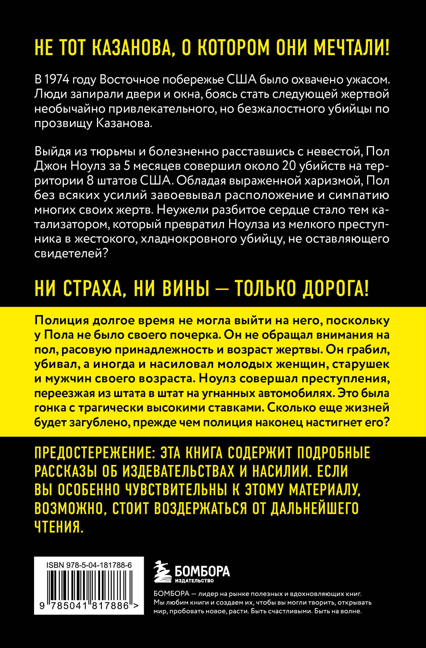 Пол Джон Ноулз (англ. Paul John Knowles; 25 апреля 1946, Орландо, Флорида - 18 декабря 1974, Джорджия) - американский серийный убийца, известный под прозвищем «Казанова», совершивший в течение 5 месяцев 1974 года 20 убийств на территории 8 штатов США. Настоящее количество жертв неизвестно. Сам Ноулз после ареста настаивал на совершении 35 убийств. Обладая выраженной харизмой, Пол Ноулс без всяких усилий завоевывал расположение и симпатию многих своих жертв. Один из самых активных серийных убийц 1970-х годов.| Издательство | ООО "Издательство "Эксмо" |
