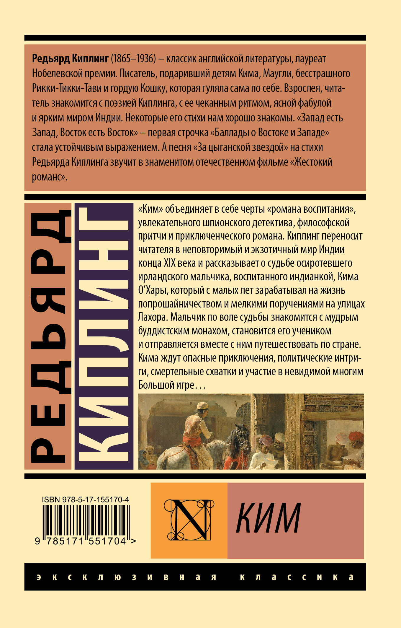 "Ким" объединяет в себе черты "романа воспитания", увлекательного шпионского детектива, философской притчи и приключенческого романа. Киплинг переносит читателя в неповторимый и экзотичный мир Индии конца XIX века и рассказывает о судьбе осиротевшего ирландского мальчика, воспитанного индианкой, Кима О'Хара, который с малых лет зарабатывал на жизнь попрошайничеством и мелкими поручениями на улицах Лахора. Мальчик по воле судьбы знакомится с мудрым буддистским монахом, становится его учеником и отправляется вместе с ним путешествовать по стране. Кима ждут опасные приключения, политические интриги, смертельные схватки и участие в невидимой многим Большой игре…| Издательство | ИЗДАТЕЛЬСТВО "АСТ" |