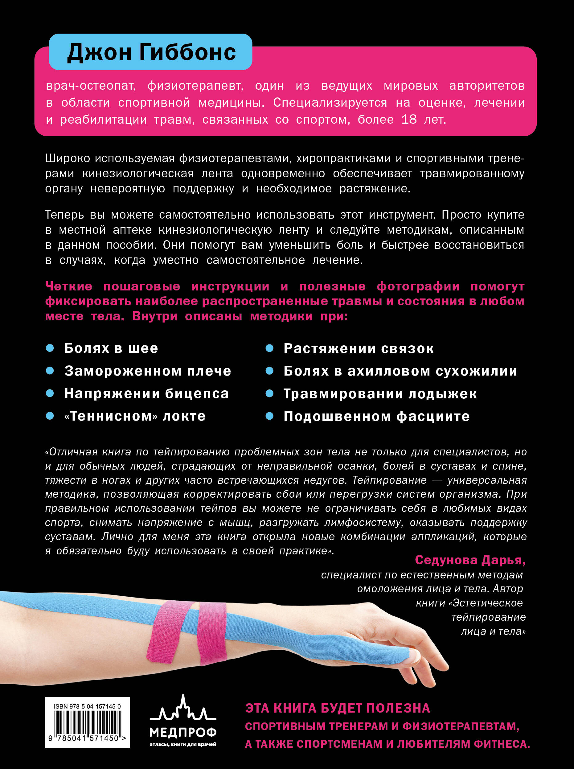 Техники кинезиологического тейпирования на разные случаи жизни - от бытовых до спортивных травм. Более 300 подробных иллюстраций и пошаговое описание методик позволяет использовать их в домашних условиях, когда это целесообразно. В книге описаны способы снять болевые ощущения с помощью накладывания тейпов в: - области шеи; - замороженном плече; - перенапряжении бицепса; - синдроме «теннисного» локтя; - растяжении связок; - болях в ахилловом сухожилии; - подошвенном фасциите.| Издательство | ООО "Издательство "Эксмо" |