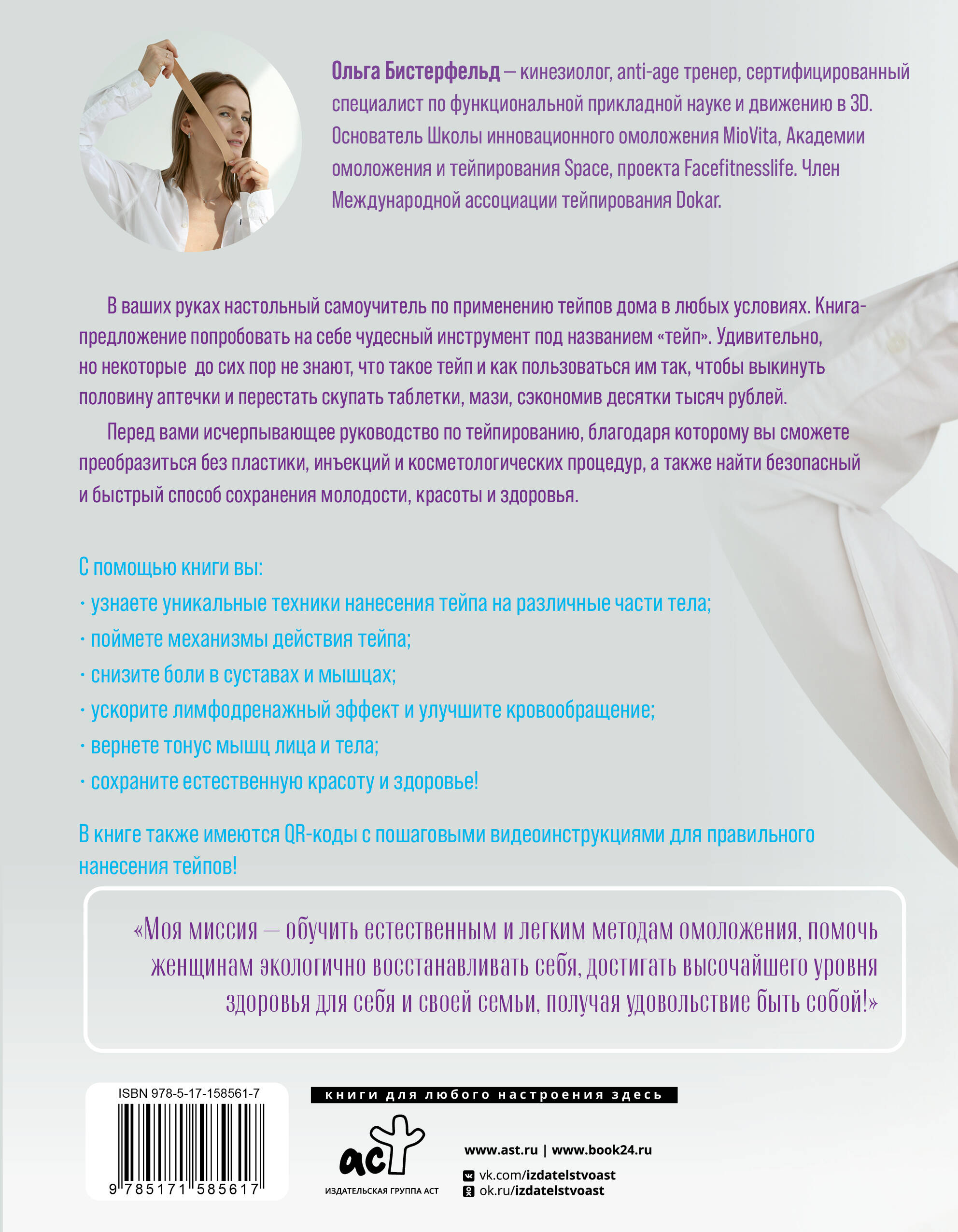 Ольга Бистерфельд - кинезиолог, anti-age тренер, сертифицированный специалист по функциональной прикладной науке и движению в 3D. Основатель Школы инновационного омоложения MioVita, Академии омоложения и тейпирования Space, проекта Facefitnesslife. Член Международной ассоциации тейпирования Dokar. В ваших руках настольный самоучитель по применению тейпов дома в любых условиях. Книга-предложение попробовать на себе чудесный инструмент под названием "тейп". Удивительно, но некоторые до сих пор не знают, что такое тейп и как пользоваться им так, чтобы выкинуть половину аптечки и перестать скупать таблетки, мази, сэкономив десятки тысяч рублей. Перед вами исчерпывающее руководство по тейпированию, благодаря которому вы сможете преобразиться без пластики, инъекций и косметологических процедур, а также найти безопасный и быстрый способ сохранения молодости, красоты и здоровья. С помощью книги вы: • узнаете уникальные техники нанесения тейпа на различные части тела; • поймете механизмы действия тейпа; • снизите боли в суставах и мышцах; • ускорите лимфодренажный эффект и улучшите кровообращение; • вернете тонус мышц лица и тела; • сохраните естественную красоту и здоровье! В книге также имеются QR-коды с пошаговыми видеоинструкциями для правильного нанесения тейпов!| Издательство | Издательство "АСТ" |