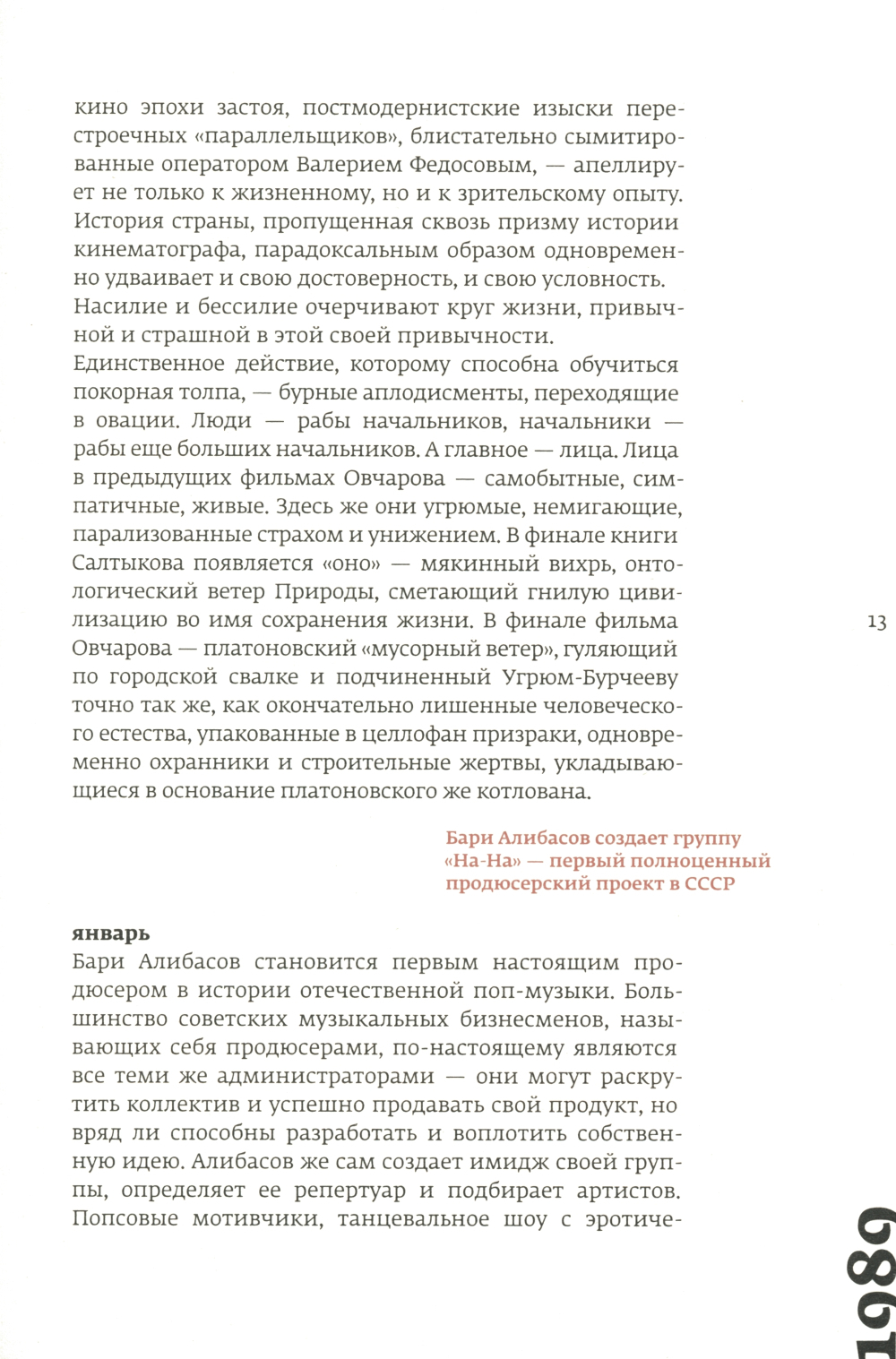 Издание «Кино и контекст» представляет собой прокомментированную хронику отечественного кинопроцесса с 1986 по 2000 год. Факты новейшей истории позднесоветского и российского кинематографа приводятся здесь в контексте истории искусства, политики, гуманитарной науки, масс-медиа и описания феноменов повседневной жизни. Второй том рассказывает о фильмах и событиях 1989-1991 годов - трех последних лет существования Советского Союза: вывод советских войск из Афганистана, появление групп «Любэ», «На-На» и «Колибри», «Нога» Тягунова и «Интердевочка» Тодоровского, гибель подлодки «Комсомолец» и «Армавир» Абдрашитова, выступление Сахарова на первом Съезде народных депутатов и «Дом под звездным небом» Соловьёва, забастовки шахтеров Кузбасса и Донбасса, возвращение Ростроповича и Вишневской, «Астенический синдром» Муратовой и «Счастливые дни» Балабанова, «Ночь саперных лопаток» в Тбилиси, падение Берлинской стены, «Круг второй» Сокурова, расцвет кооператоров и премьера «Поля чудес», «Сады скорпиона» Ковалова, «Облако-рай» Досталя и «Переход товарища Чкалова через Северный полюс» Пежемского, убийство Меня, гибель Дягилевой, арест Чикатило, «Оно» Овчарова, «Духов день» Сельянова и «Сатана» Аристова, появление Барби и «Лего», открытие McDonald's в Москве и «табачный бунт» в Ленинграде, «Так жить нельзя» Говорухина, «Караул» Рогожкина и «Закат» Зельдовича, успех советского кино в Каннах, «Замри - умри - воскресни!» Каневского, «Мать» Панфилова и «Такси-блюз» Лунгина, вручение Нобелевской премии Горбачёву, межнациональные конфликты в Союзных республиках, крушения коммунистических режимов в Восточной Европе и «парад суверенитетов», «Цареубийца» Шахназарова и «Миф о Леониде» Долинина, приход Ельцина, подписание Беловежского соглашения и, наконец, распад СССР.| Издательство | СЕАНС |