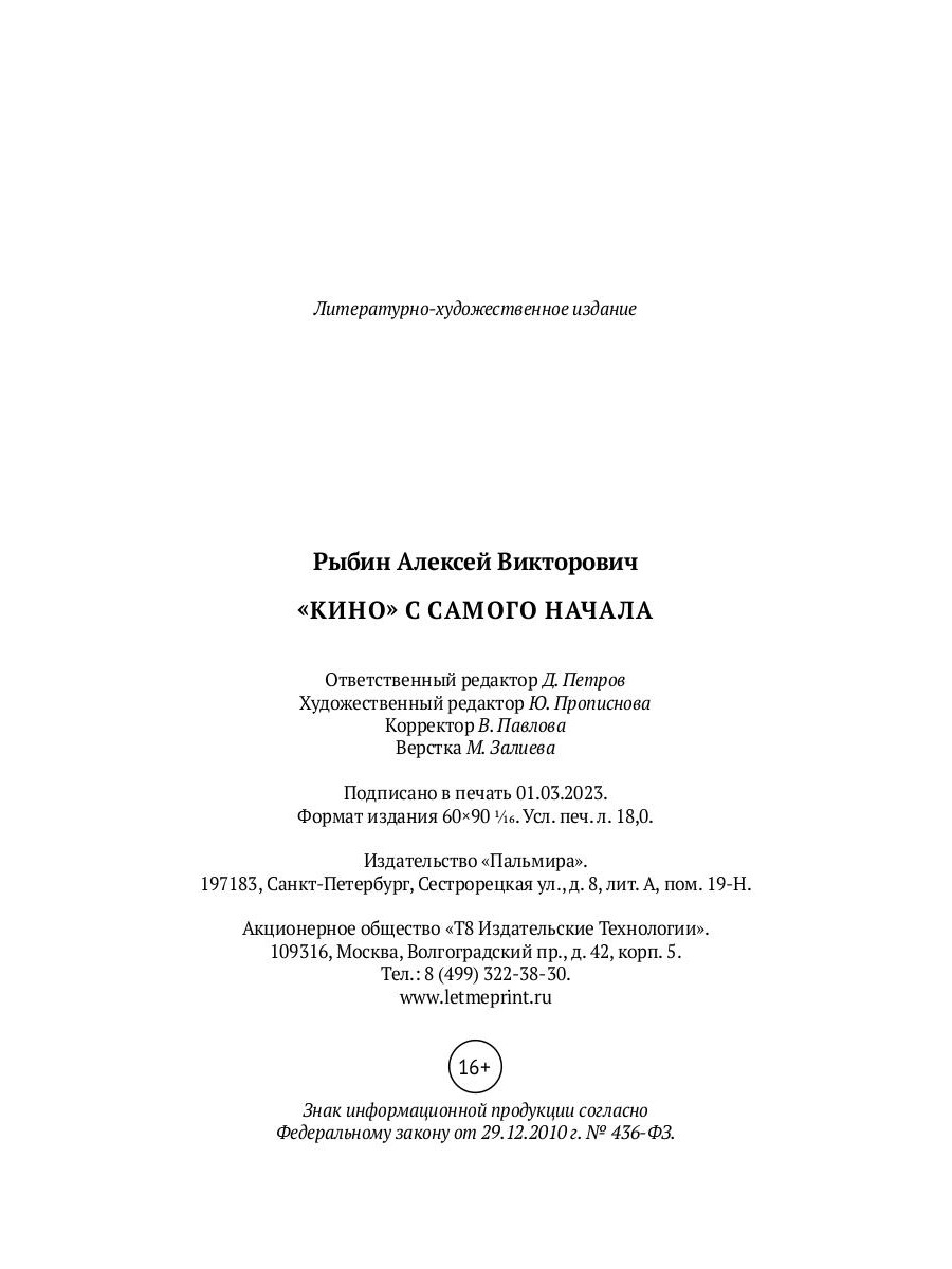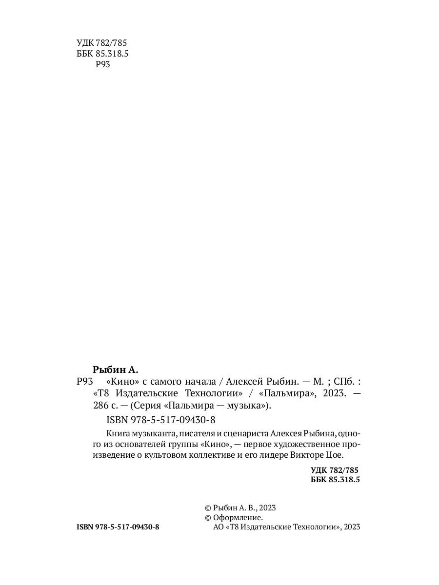 Алексей Рыбин (р. 1960) - музыкант, участник первого состава группы "Кино", писатель, журналист, сценарист, ведущий на петербургском "Радио Рокс". ""Кино" с самого начала" - первая книга о культовом коллективе и его лидере Викторе Цое.| Издательство | РИПОЛ классик Группа Компаний ООО |
