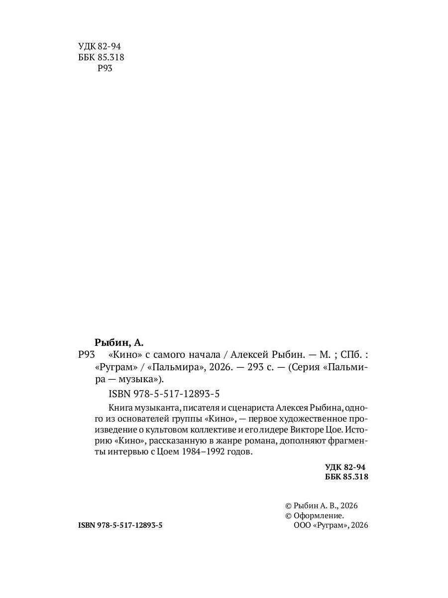 Книга музыканта, писателя и сценариста Алексея Рыбина, одного из основателей группы «Кино», - первое художественное произведение о культовом коллективе и его лидере Викторе Цое. Историю «Кино», рассказанную в жанре романа, дополняют фрагменты интервью с Цоем 1984-1992 годов.| Издательство | Т8 RUGRAM |