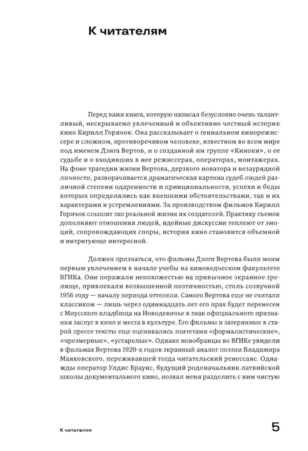 Советский режиссер, пионер документального кино Дзига Вертов в 1920-е годы создал группу кинематографистов под названием «Киноки». Их главным объединяющим лозунгом была борьба со всякого рода инсценировкой на экране. Режиссер верил, что документальная съемка открывает новую правду о реальности и помогает объяснить сложность мира простому зрителю. Члены группы работали в эпицентре хаоса послереволюционной жизни: в толпе на улице, в шахтах и на заводах, в клубах и кабаках. Киноки часто рисковали жизнью, без страховки забираясь на крыши домов или вместе с шахтерами спускаясь под землю. Бесстрашие было особой гордостью операторов коллектива. Но уже в 1930-е годы опыт Вертова и киноков был раскритикован, и вскоре о киноках забыли... Как сложились судьбы членов группы: Ильи Копалина, Ивана Белякова, Бориса Цейтлина, Михаила Кауфмана, Елизаветы Свиловой и других? Почему коллектив распался, не просуществовав и десяти лет, и почему открытия киноков перестали быть востребованными в 1930-е годы? Почему имя Дзиги Вертова и его идеи живы и до сих пор привлекают режиссеров, киноведов и тех, кто интересуется кино? На эти и многие другие вопросы отвечает автор книги - Кирилл Горячок, историк кино, преподаватель, кандидат философских наук, лауреат премии Гильдии киноведов и кинокритиков (2020).