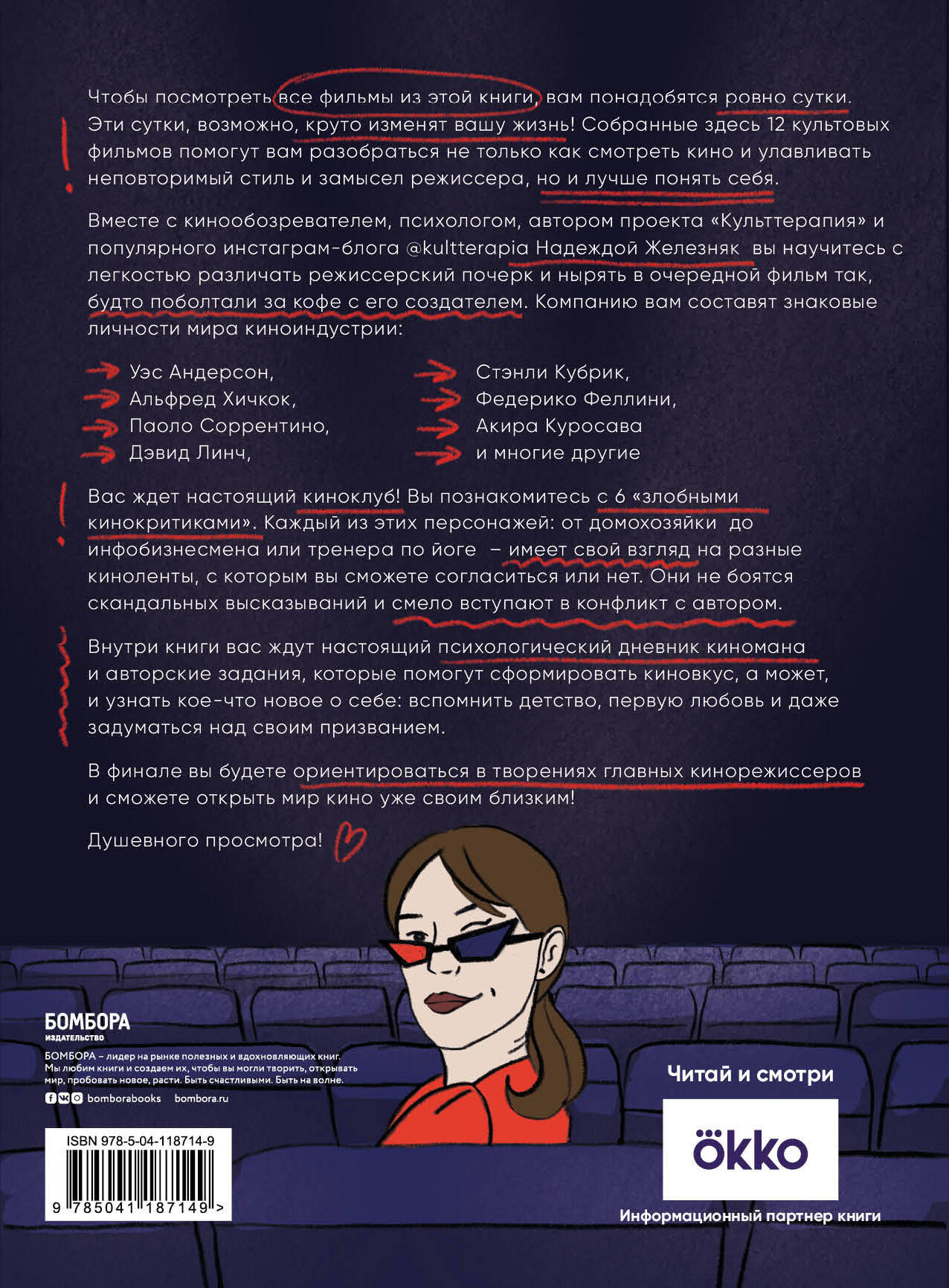 Чтобы посмотреть все фильмы из этой книги, вам понадобятся ровно сутки. И, возможно, эти сутки смогут круто поменять вашу жизнь! Ведь собранные здесь 12 фильмов от культовых кинорежиссеров помогут вам разобраться не только с тем, как смотреть кино и улавливать замысел автора, но и лучше понять себя. Вместе с психологом, киножурналистом, автором проекта «Культтерапия» и популярного блога в социальных сетях Надеждой Железняк вы изучите фильмы самых разных эпох и стран, узнаете, как отличить шедевр от проходимца и сформировать свой личный список фаворитов. Без напряжения, принуждения и нудных лекций! Каждая из кинолент здесь затрагивает важную тему: детство, красота, любовь, одиночество, расставание, старение, воспоминания, муки выбора и поиск собственного пути. Вы научитесь с легкостью различать режиссерский почерк и нырять в очередной фильм так, будто поболтали за кофе с его создателем. Компанию вам составят знаковые личности мира киноиндустрии: • Уэс Андерсон • Альфред Хичкок • Паоло Соррентино • Дэвид Линч • Стэнли Кубрик • Федерико Феллини • Акира Куросава • Мишель Гондри и другие. А чтобы вам всегда было с кем обсудить увиденное, в книге вы познакомитесь с шестью «злобными кинокритиками». Каждый из этих персонажей - от домохозяйки до феминистки - имеет свой взгляд на разные киноленты, с которым вы сможете согласиться или нет. Кинорешебник полностью интерактивный и содержит задания до просмотра и после. А дневник зрителя поможет отследить прогресс. В финале вы будете ориентироваться в творениях главных кинорежиссеров и сможете открыть мир кино уже своим близким! Душевного просмотра!| Издательство | ООО "Издательство "Эксмо" |