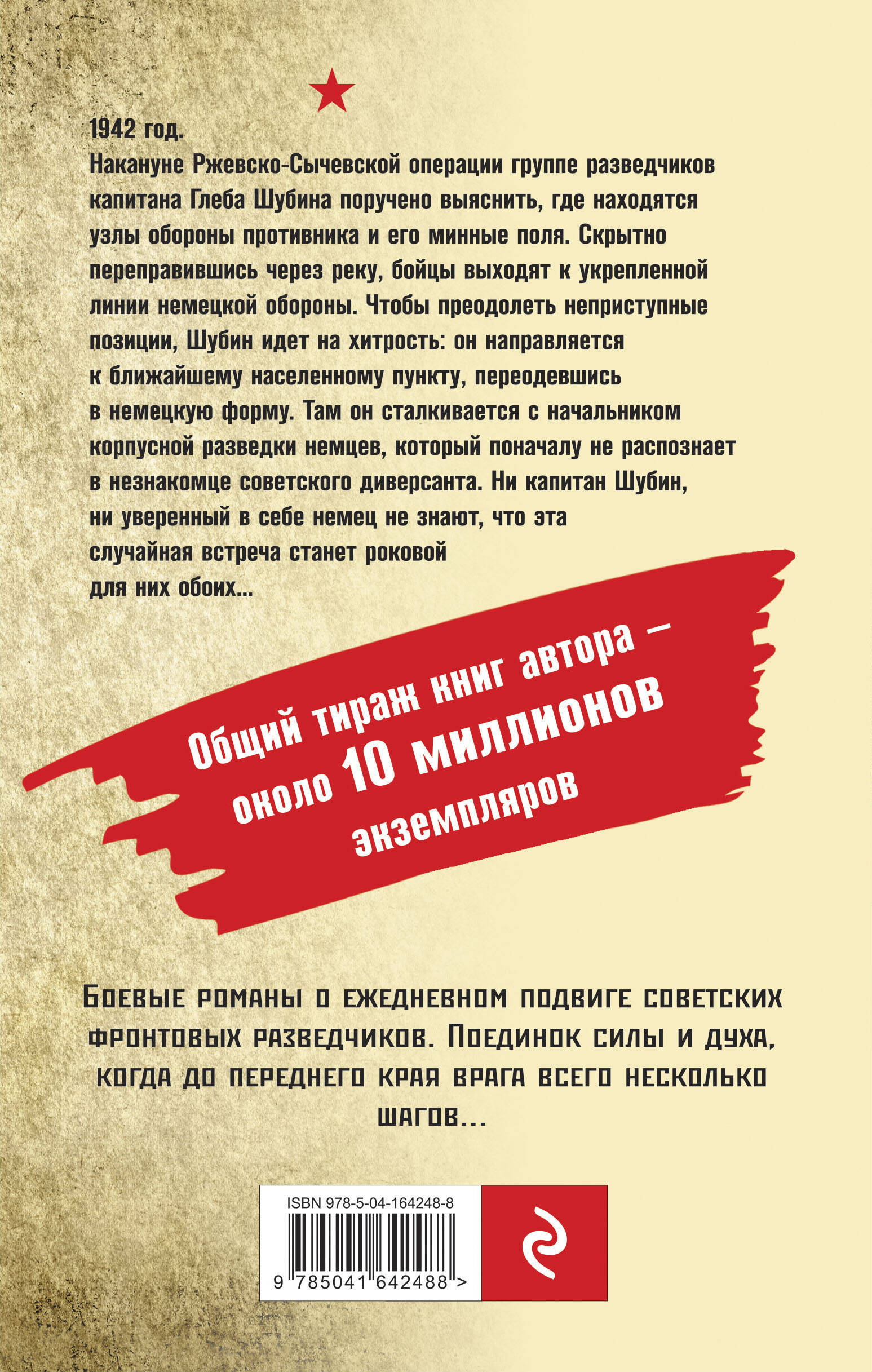 Боевые романы о ежедневном подвиге советских фронтовых разведчиков. Поединок силы и духа, когда до переднего края врага всего несколько шагов. Подробности жестоких боев, о которых не рассказывают даже ветераны - участники тех событий. 1942 год. Накануне Ржевско-Сычевской операции группе разведчиков капитана Глеба Шубина поручено выяснить, где находятся узлы обороны противника и его минные поля. Скрытно переправившись через реку, бойцы выходят к укрепленной линии немецкой обороны. Чтобы преодолеть неприступные позиции, Шубин идет на хитрость: он направляется к ближайшему населенному пункту, переодевшись в немецкую форму. Там он сталкивается с начальником корпусной разведки немцев, который поначалу не распознает в незнакомце советского диверсанта. Ни капитан Шубин, ни уверенный в себе немец не знают, что эта случайная встреча станет роковой для них обоих… Общий тираж книг автора - более 10 миллионов экземпляров.