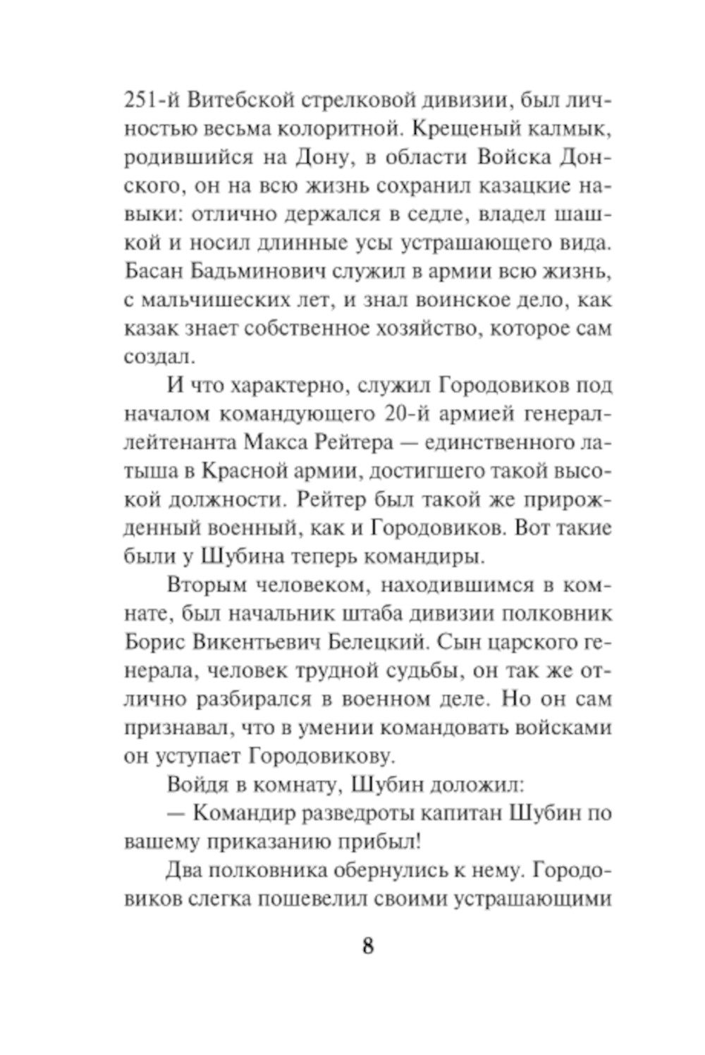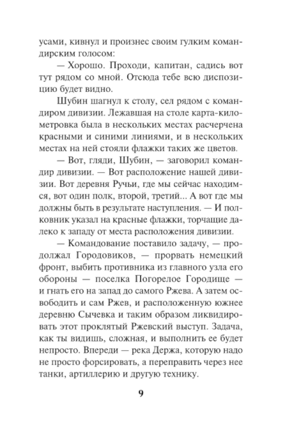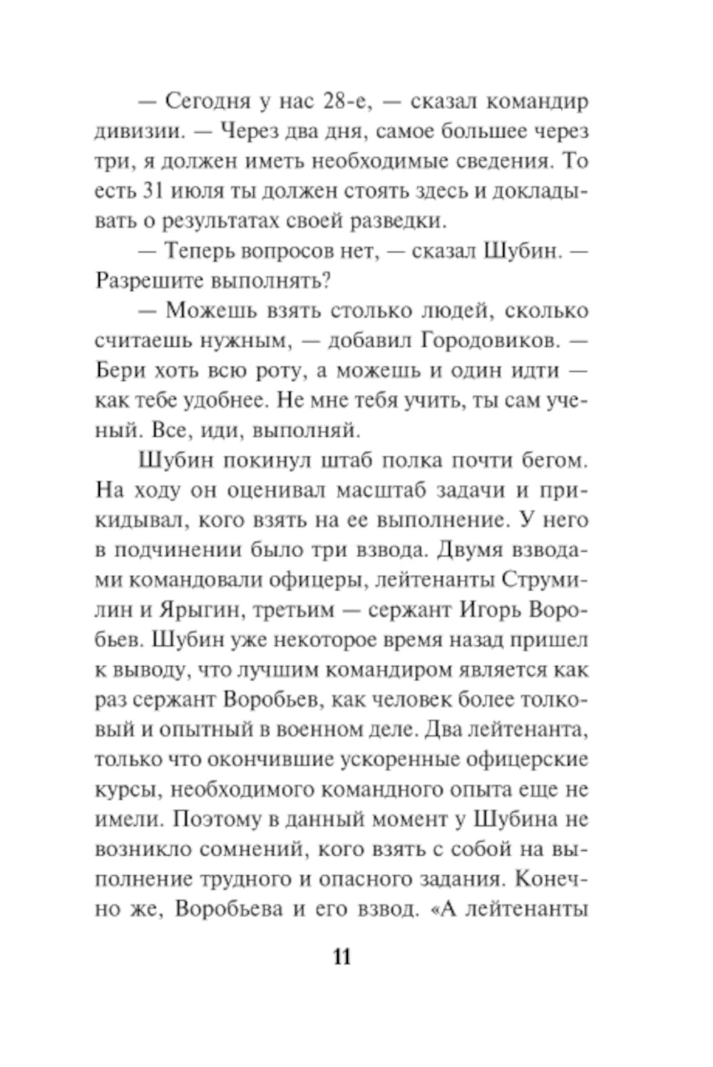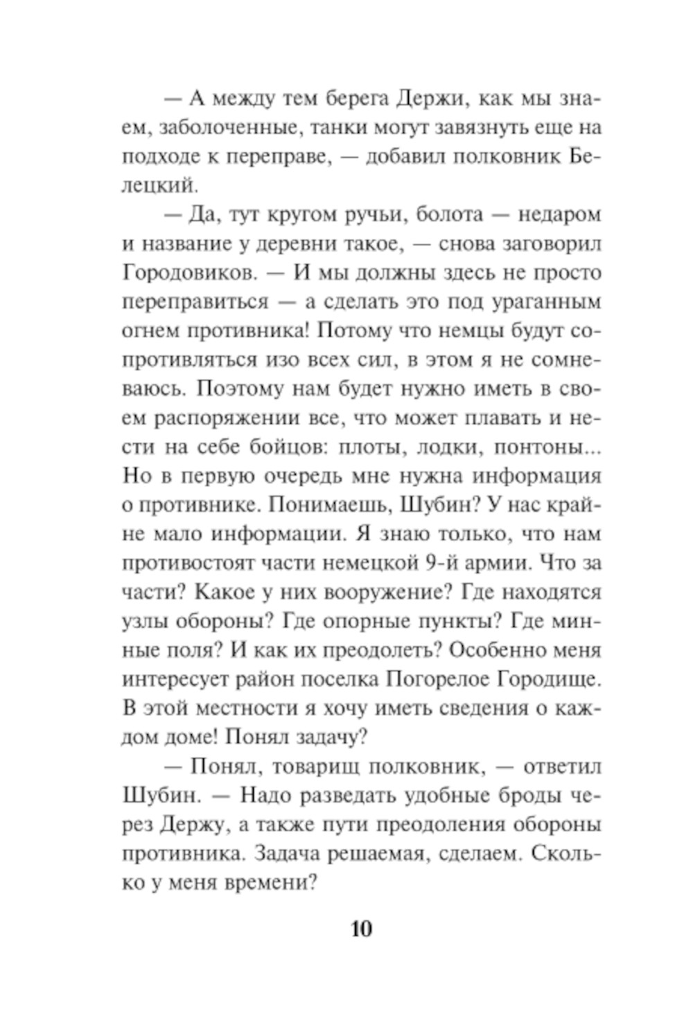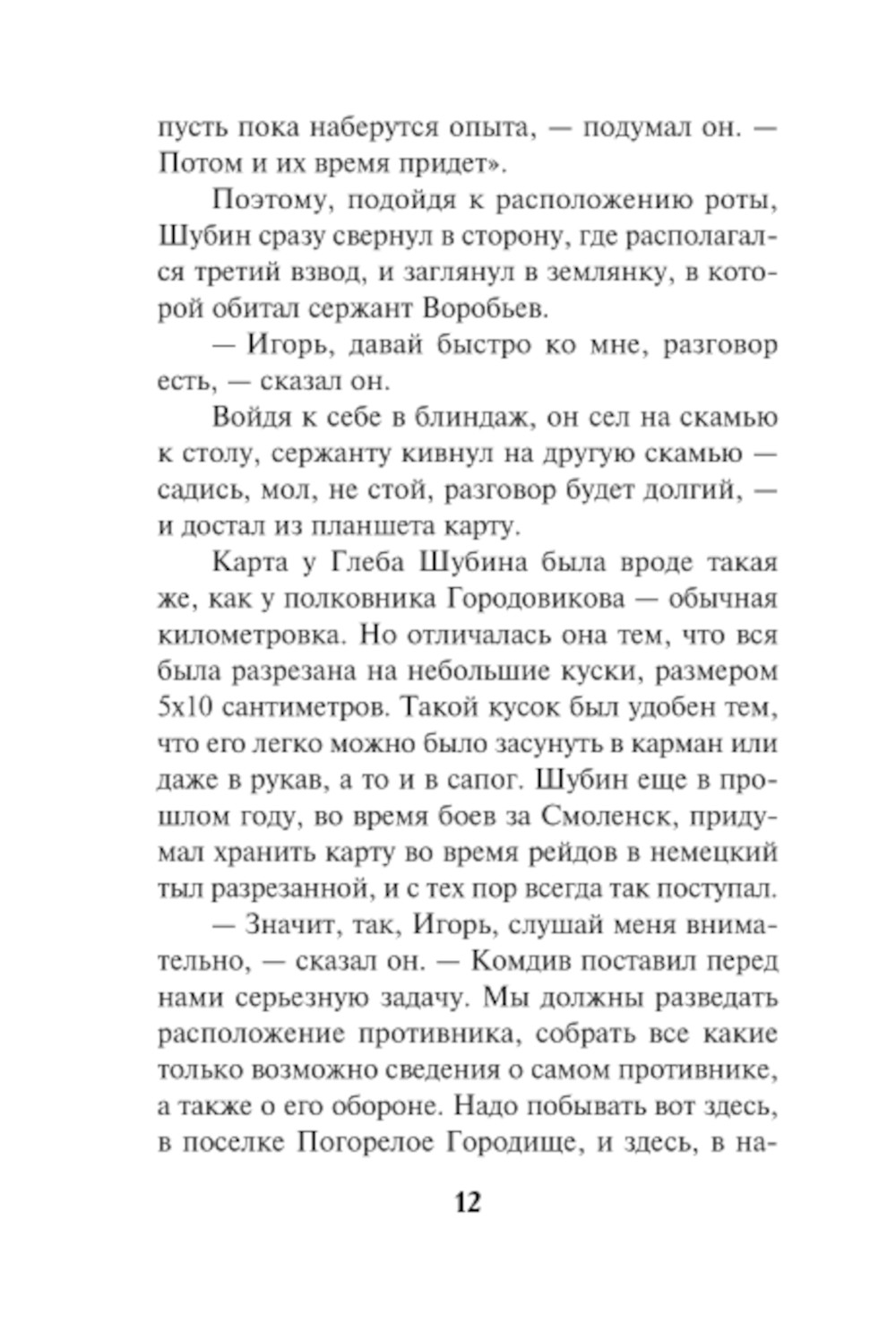 1942 год. Накануне Ржевско-Сычевской операции группе разведчиков капитана Глеба Шубина поручено выяснить, где находятся узлы обороны противника и его минные поля. Скрытно переправившись через реку, бойцы выходят к укрепленной линии немецкой обороны. Чтобы преодолеть неприступные позиции, Шубин идет на хитрость: он направляется к ближайшему населенному пункту, переодевшись в немецкую форму. Там он сталкивается с начальником корпусной разведки немцев, который поначалу не распознает в незнакомце советского диверсанта. Ни капитан Шубин, ни уверенный в себе немец не знают, что эта случайная встреча станет роковой для них обоих...| Издательство | Эксмо |