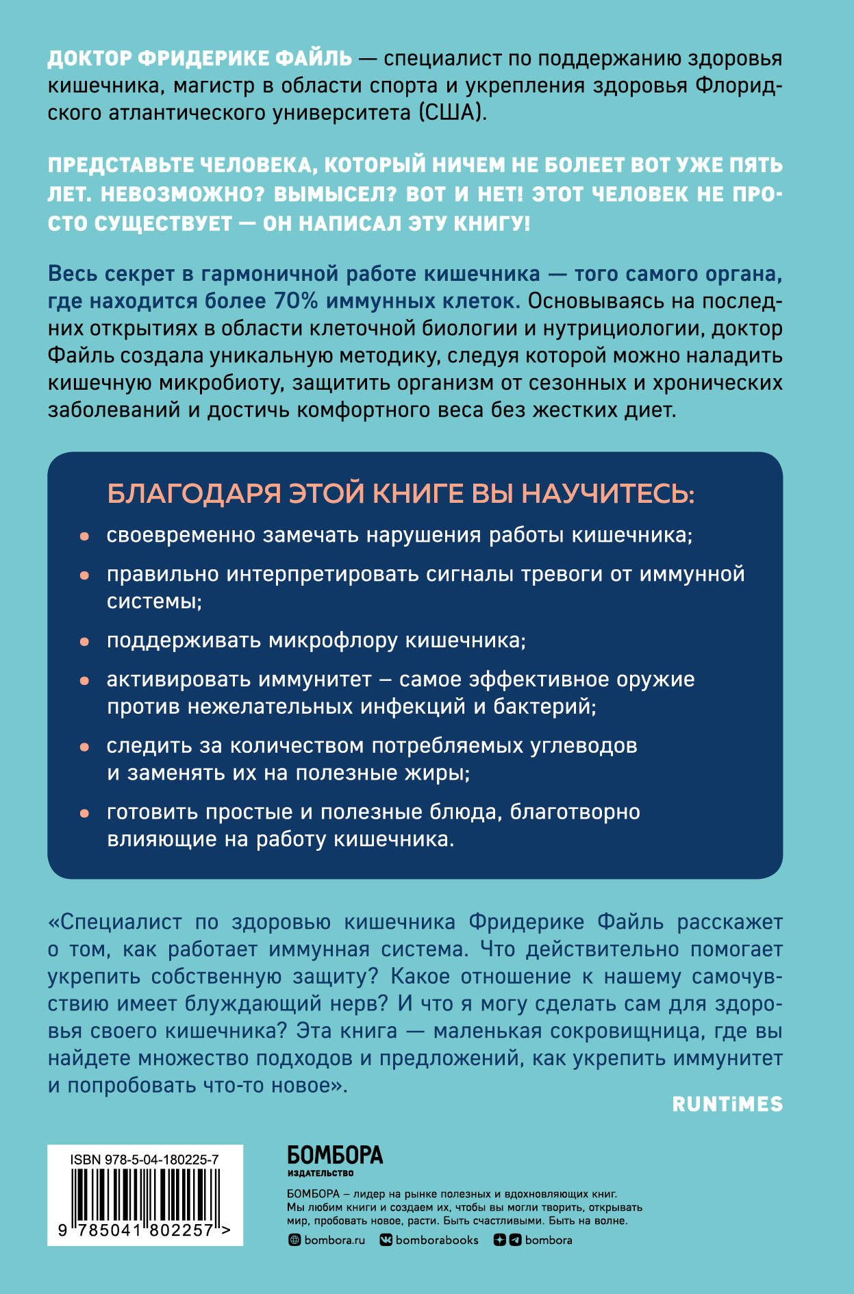 Доктор Фридерике Файль - специалист по поддержанию здоровья кишечника, магистр в области спорта и укрепления здоровья Флоридского атлантического университета (США). Представьте человека, который НИЧЕМ не болеет вот уже пять лет. Невозможно? Вымысел? Вот и нет! Этот человек не просто существует - он написал эту книгу! Весь секрет в гармоничной работе кишечника - того самого органа, где находится более 70% иммунных клеток. Основываясь на последних открытиях в области клеточной биологии и нутрициологии, доктор Файль создала уникальную методику, следуя которой можно наладить кишечную микробиоту, защитить организм от сезонных и хронических заболеваний и достичь комфортного веса без жестких диет. Благодаря этой книге вы научитесь: • своевременно замечать нарушения работы кишечника; • правильно интерпретировать сигналы тревоги от иммунной системы; • поддерживать микрофлору кишечника; • активировать иммунитет - самое эффективное оружие против нежелательных инфекций и бактерий; • следить за количеством потребляемых углеводов и заменять их на полезные жиры; • готовить простые и полезные блюда, благотворно влияющие на работу кишечника.