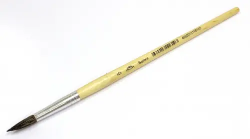 Кисть круглая из волоса Белки №5. При намокании волос белки собирается в плотный пучок с тонким кончиком, поэтому такие кисти подходят для рисования тонких линий и аккуратной работы. Пучок надежно вклеен в металлическую обойму. Обойма закреплена на деревянной ручке двойным обжатием. Благодаря многослойному лаковому покрытию пользоваться кистью удобно и приятно. Кисть предназначена для рисования гуашью, акварелью, акриловыми красками, а также для нанесения клея.
