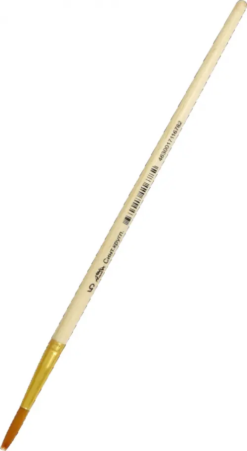 Кисть круглая из синтетического волоса №5. Аналог натурального волоса, параметры мягкости и эластичности практически идентичны, напоняемость краской немного ниже. Пучок надежно вклеен в металлическую обойму. Обойма закреплена на деревянной ручке двойным обжатием. Кисть предназначена для рисования гуашью, масленными и акриловыми красками, а также для нанесения клея.