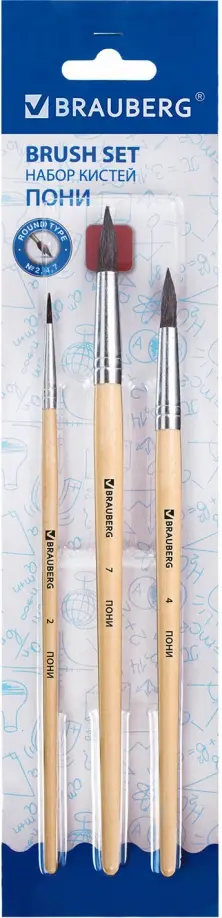 Кисти "Brauberg", 3 штуки, из ворса пони, круглые, №2, 4, 7