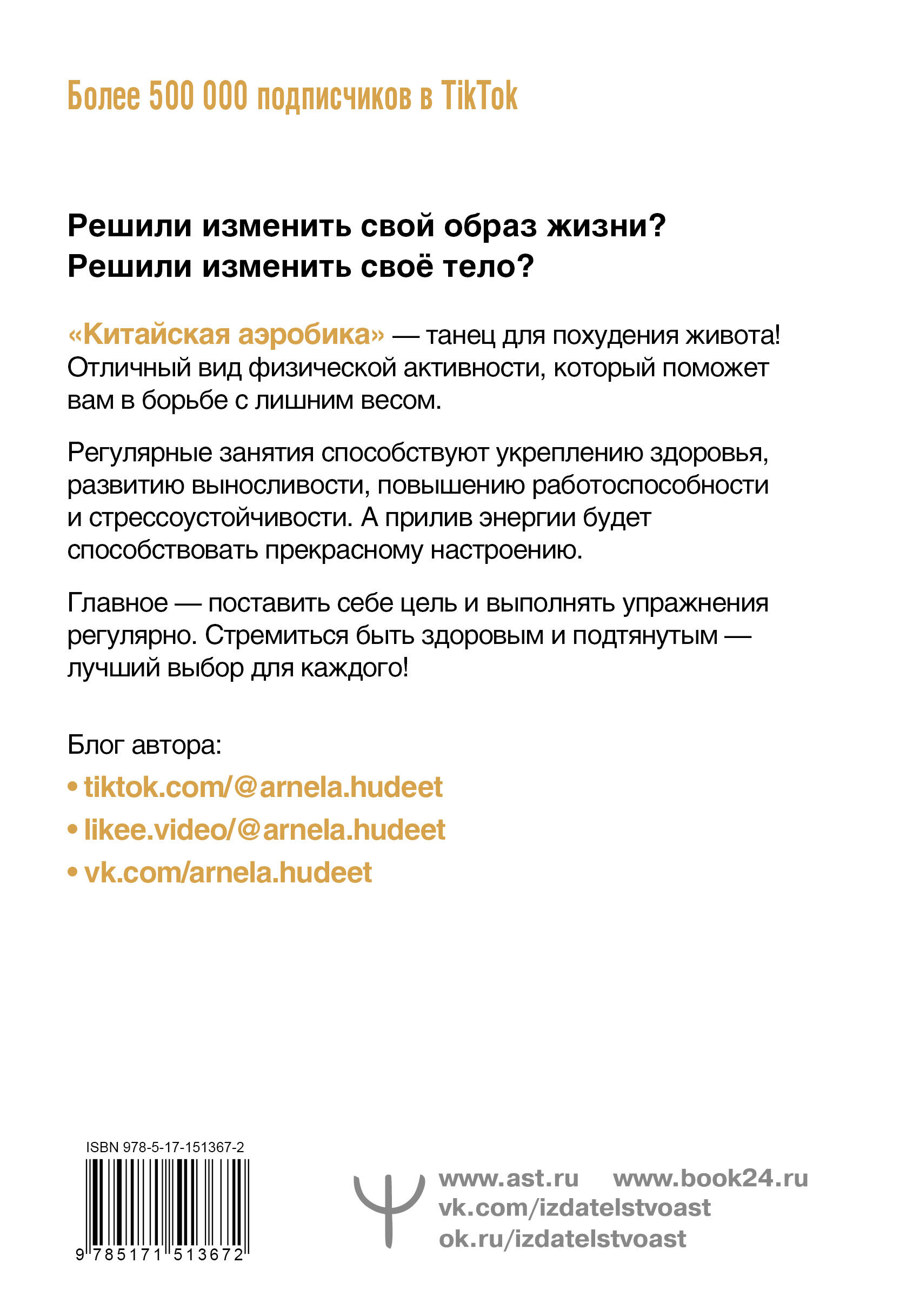 «Китайская аэробика» - на сегодняшний день является популярным направлением в фитнесе, которое состоит из комплекса упражнений: менее подвижные переходят к более подвижным. Если вы хотите попробовать для себя что-то новое и занимательное, то это ваш шанс начать комплексные тренировки и выработать полезные привычки. Но помните, что главное, не искать себе оправданий, а начать действовать только из позитивных установок и любви к себе - с этой книгой вы сделаете ещё один шаг к самосовершенствованию и здоровому образу жизни.| Издательство | ИЗДАТЕЛЬСТВО "АСТ" |