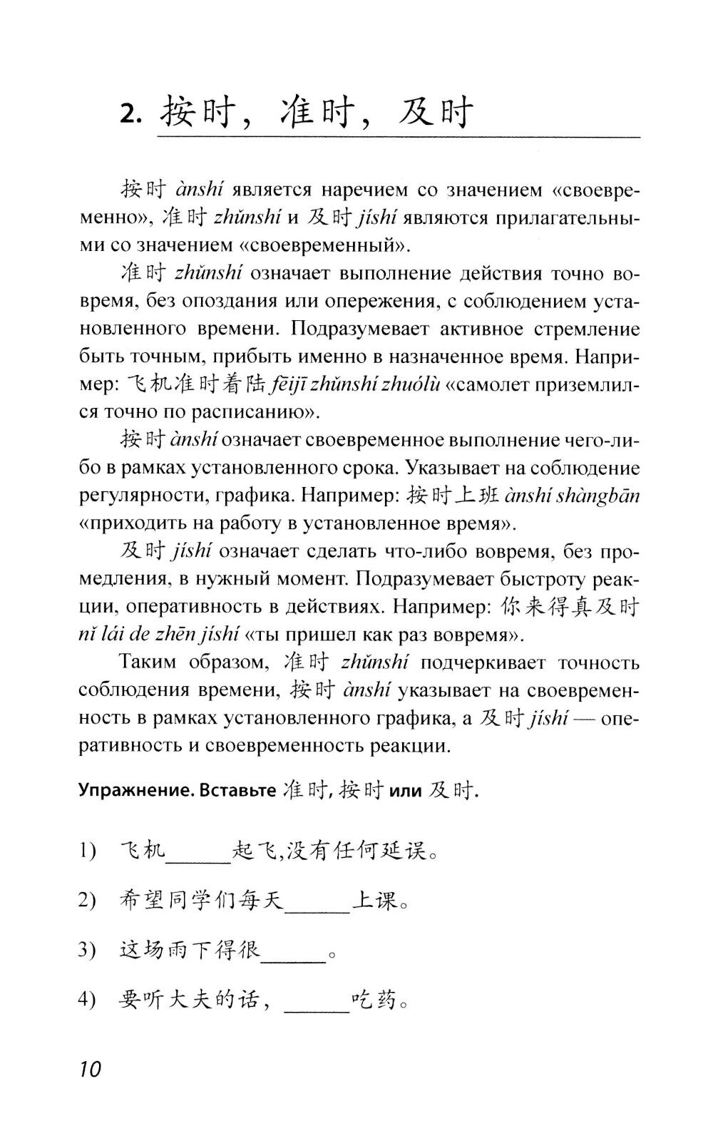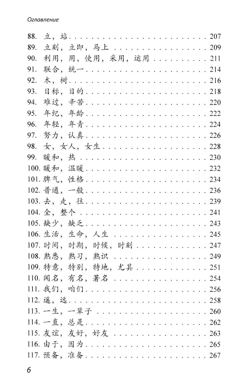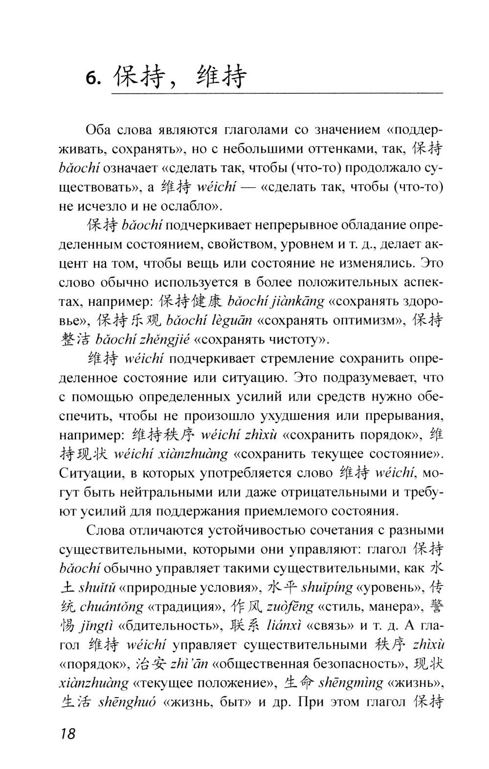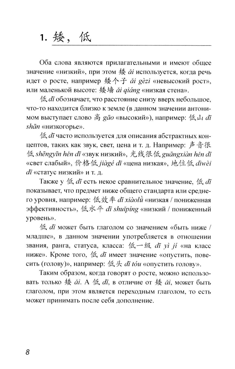 Настоящее пособие представляет собой систематизированное описание синонимичных лексических единиц, а также близких по значению слов и словосочетаний, объединенных в 120 тематических групп. Всего рассматриваются 290 лексем, различающихся по частеречной принадлежности, семантическим оттенкам, сочетаемости и др. Особое внимание уделяется коннотационным аспектам значения, типичным моделям употребления, а также стилистической маркированности слов. Каждая группа снабжена примерами употребления с переводом и краткими пояснениями. Для закрепления материала после каждого раздела предусмотрены упражнения на выбор и подстановку, способствующие лучшему усвоению различий между лексемами. Пособие адресовано студентам начальных курсов, изучающим китайский язык как первый или второй иностранный, и может быть использовано преподавателями в качестве вспомогательного учебно-справочного материала. Кроме того, оно может служить дополнительным ресурсом при подготовке к экзамену HSK и способствовать формированию устойчивых лексико-грамматических навыков и точному пониманию значений слов в контексте.| Издательство | Восточная книга |
