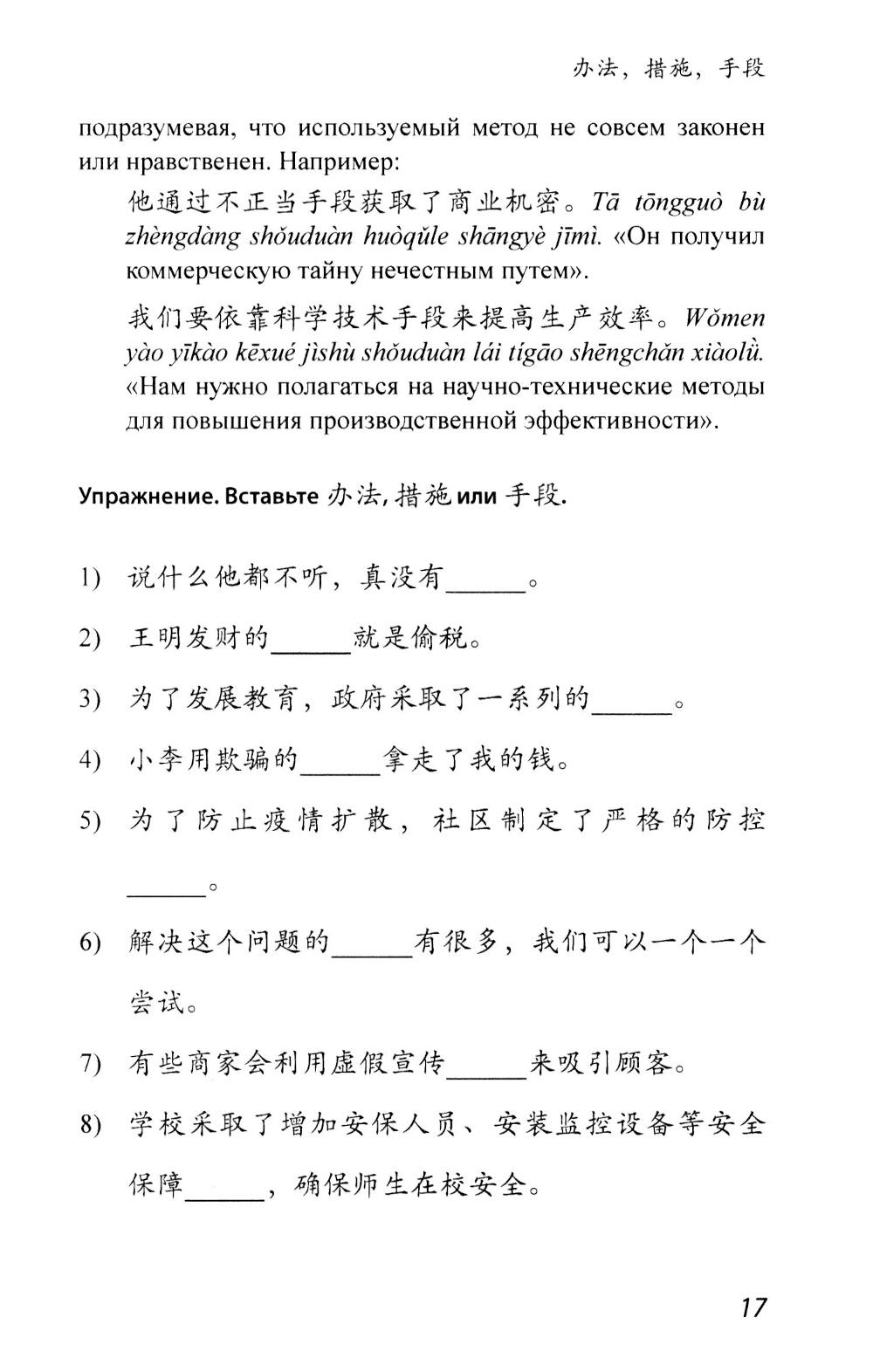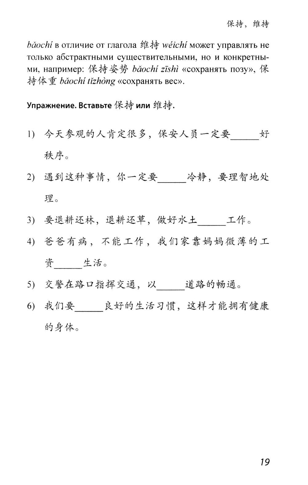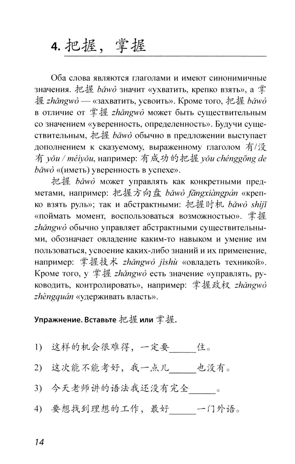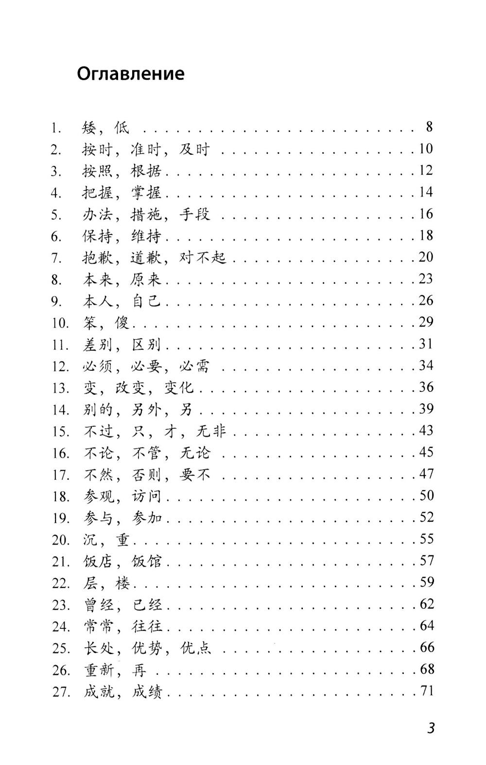 Настоящее пособие представляет собой систематизированное описание синонимичных лексических единиц, а также близких по значению слов и словосочетаний, объединенных в 120 тематических групп. Всего рассматриваются 290 лексем, различающихся по частеречной принадлежности, семантическим оттенкам, сочетаемости и др. Особое внимание уделяется коннотационным аспектам значения, типичным моделям употребления, а также стилистической маркированности слов. Каждая группа снабжена примерами употребления с переводом и краткими пояснениями. Для закрепления материала после каждого раздела предусмотрены упражнения на выбор и подстановку, способствующие лучшему усвоению различий между лексемами. Пособие адресовано студентам начальных курсов, изучающим китайский язык как первый или второй иностранный, и может быть использовано преподавателями в качестве вспомогательного учебно-справочного материала. Кроме того, оно может служить дополнительным ресурсом при подготовке к экзамену HSK и способствовать формированию устойчивых лексико-грамматических навыков и точному пониманию значений слов в контексте.| Издательство | Восточная книга |