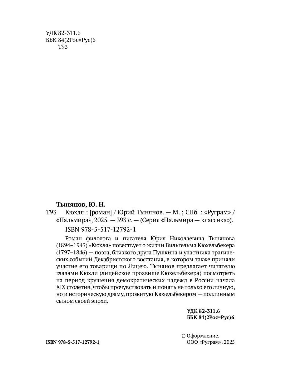 Роман филолога и писателя Юрия Николаевича Тынянова (1894-1943) «Кюхля» повествует о жизни Вильгельма Кюхельбекера (1797-1846) - поэта, близкого друга Пушкина и участника трагических событий Декабристского восстания, в котором также приняли участие его товарищи по Лицею. Тынянов предлагает читателю глазами Кюхли (лицейское прозвище Кюхельбекера) посмотреть на период крушения демократических надежд в России начала XIX столетия, чтобы прочувствовать и понять не только его личную, но и историческую драму, прожитую Кюхельбекером - подлинным сыном своей эпохи.| Издательство | Т8 RUGRAM |