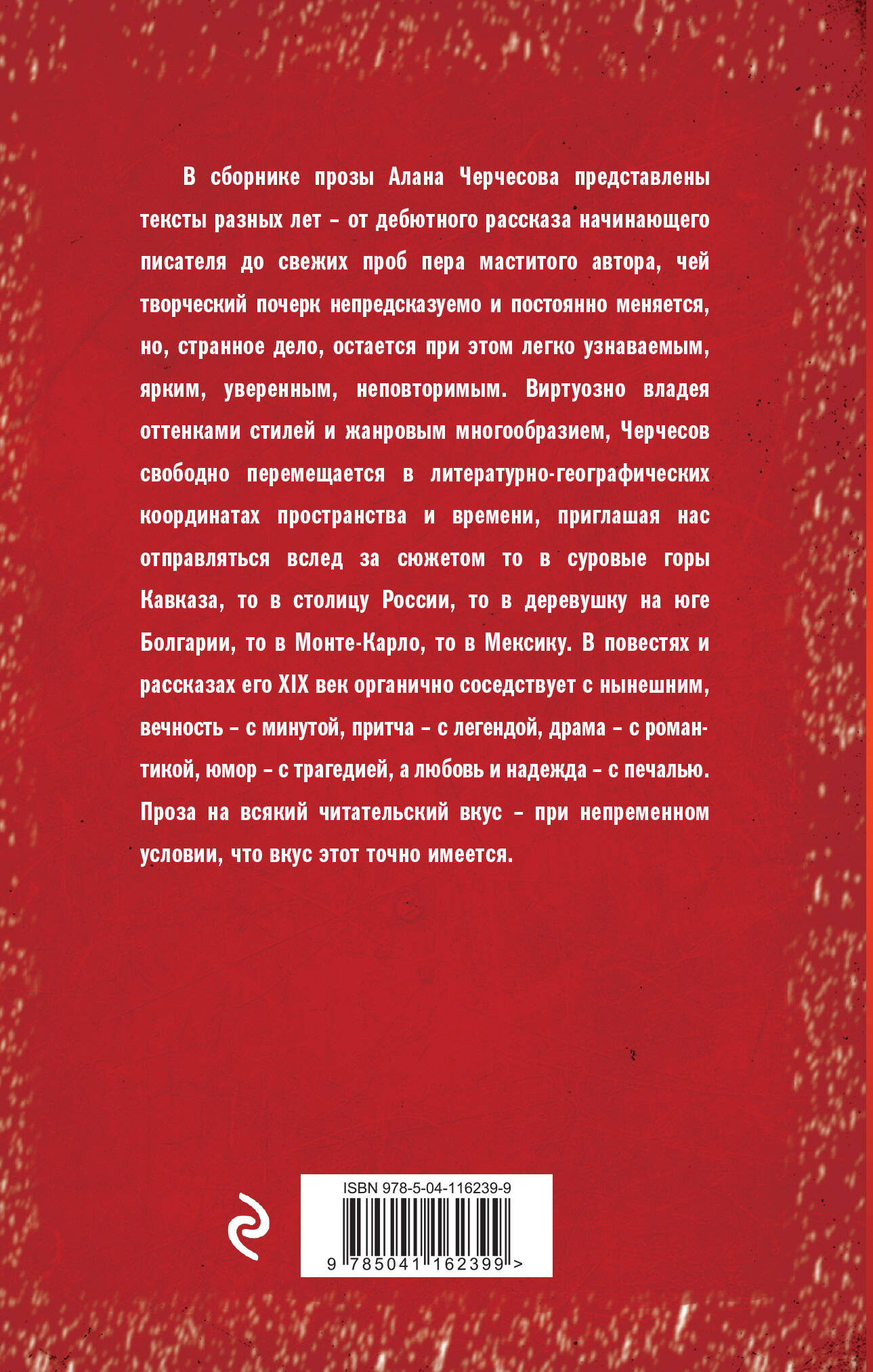 В сборнике прозы Алана Черчесова представлены тексты разных лет - от дебютного рассказа начинающего писателя до свежих проб пера маститого автора, чей творческий почерк непредсказуемо и постоянно меняется, но, странное дело, остается при этом легко узнаваемым, ярким, уверенным, неповторимым. Виртуозно владея оттенками стилей и жанровым многообразием, Черчесов свободно перемещается в литературно-географических координатах пространства и времени, приглашая нас отправляться вслед за сюжетом то в суровые горы Кавказа, то в столицу России, то в деревушку на юге Болгарии, то в Монте-Карло, то в Мексику. В повестях и рассказах его XIX век органично соседствует с нынешним, вечность - с минутой, притча - с легендой, драма - с романтикой, юмор - с трагедией, а любовь и надежда - с печалью. Проза на всякий читательский вкус - при непременном условии, что вкус этот точно имеется. Литературные премии Алана Черчесова: 2001 г. - Малая премия им. Аполлона Григорьева Академии русской современной словесности за роман «Венок на могилу ветра». 2001 г. - Финалист премии «Букер» за роман «Венок на могилу ветра». 2001 г. - Номинант премии «Национальный бестселлер» за роман «Венок на могилу ветра». 2005 г. - Премия журнала «Октябрь» за лучшую публикацию года за роман «Вилла Бель-Летра». 2006 г. - Финалист премии «Русский Букер» за роман «Вилла Бель-Летра». 2006 г. - Номинант премии «Большая книга» за роман «Вилла Бель-Летра». 2012 г. - Номинант премии «Большая книга» за роман «Дон Иван».| Издательство | ООО "Издательство "Эксмо" |