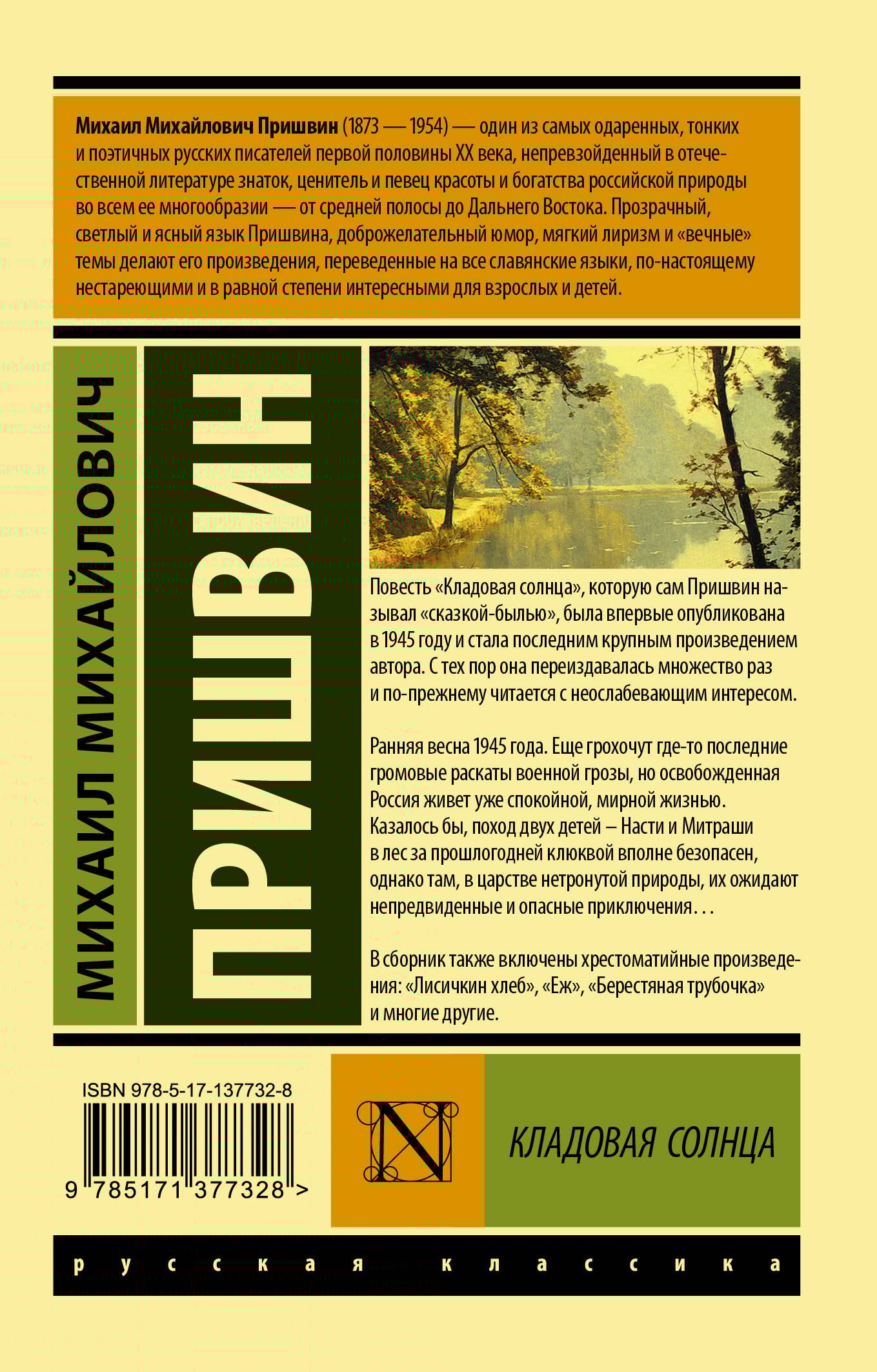Повесть "Кладовая солнца", которую сам Пришвин называл "сказкой-былью", была впервые опубликована в 1945 году и стала последним крупным произведением автора. С тех пор она переиздавалась множество раз и по-прежнему читается с неослабевающим интересом. Ранняя весна 1945 года. Еще грохочут где-то последние громовые раскаты военной грозы, но освобожденная Россия живет уже спокойной, мирной жизни. Казалось бы, поход двух детей - Насти и Митраши в лес за прошлогодней клюквой вполне безопасен, однако там, в царстве нетронутой природы их ожидают непредвиденные и опасные приключения… В сборник также включены хрестоматийные произведения: "Лисичкин хлеб", "Еж", "Берестяная трубочка" и многие другие.| Издательство | ИЗДАТЕЛЬСТВО "АСТ" |