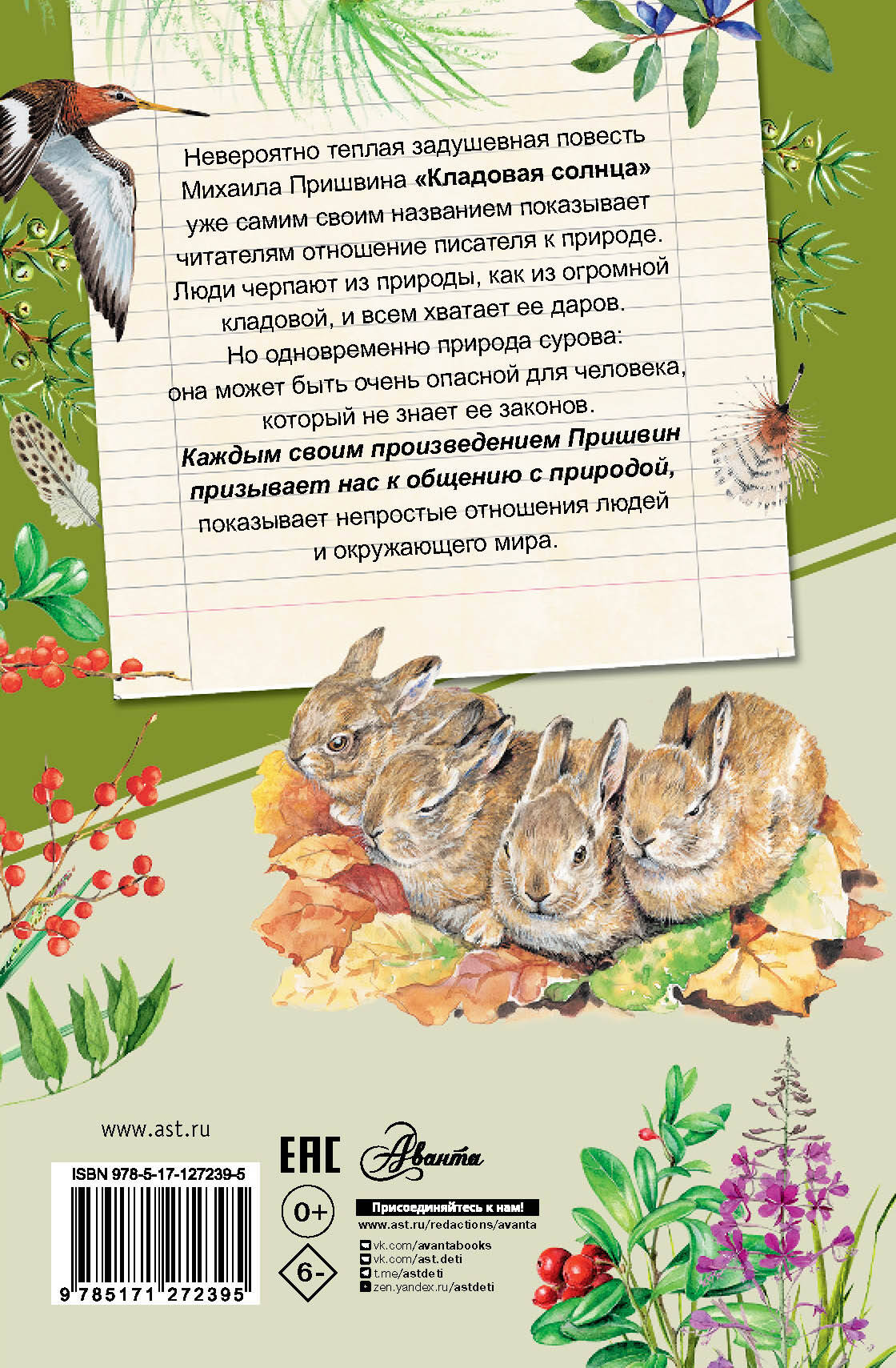 Невероятно теплая задушевная повесть Михаила Пришвина "Кладовая солнца" уже самим своим названием показывает читателям отношение писателя к природе. Люди черпают из природы, как из огромной кладовой, и всем хватает ее даров. Но одновременно природа сурова: она может быть очень опасной для человека, который не знает ее законов. Каждым своим произведением Пришвин призывает нас к общению с природой, показывает непростые отношения людей и окружающего мира. Для младшего школьного возраста.| Издательство | ИЗДАТЕЛЬСТВО "АСТ" |