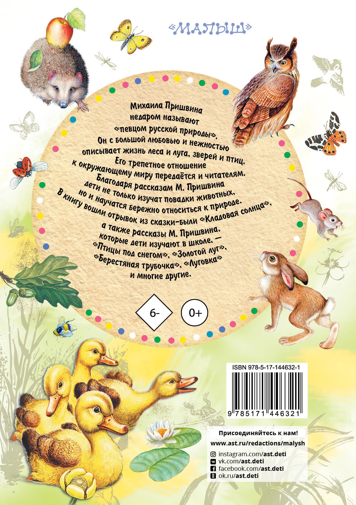 В сборник вошли рассказы писателя-натуралиста Михаила Михайловича Пришвина, которые дети изучают в школе: "Золотой луг", "Лесной доктор", "Выскочка", "Птицы под снегом" и многие другие, а также отрывок из сказки-были "Кладовая солнца". Чуткое ухо и зоркий глаз охотника и большое, доброе сердце настоящего ценителя природы помогали Михаилу Пришвину создавать увлекательные истории о жизни животных и птиц, раскрывать тайны окружающего мира и учить читателя бережному отношению ко всему живому. Из книги дети узнают, кто такой синий лапоть, как разговаривают деревья, почему из-за филина поднялся переполох в лесу и что хранится в берестяной трубочке. Рисунки И. Цыганкова. Для младшего школьного возраста.| Издательство | ИЗДАТЕЛЬСТВО "АСТ" |