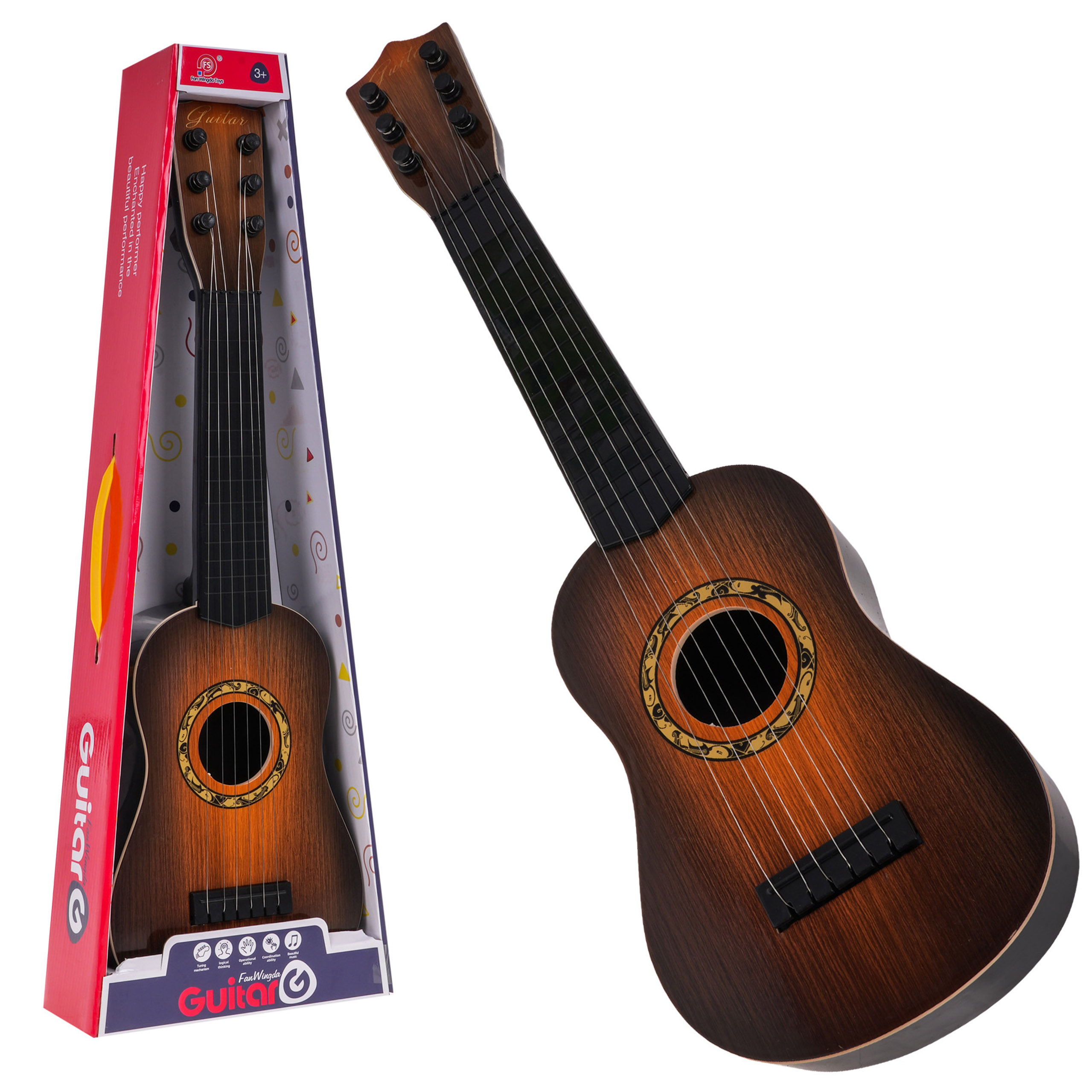 Красиво выполненная коричневая классическая гитара - предложение для маленьких музыкантов от 3 лет. Гитара отлично имитирует настоящий инструмент, у нее 6 железных струн и колки на грифе, благодаря чему звук похож на звучание классической гитары. Игрушка изготовлена из высококачественного пластика с деревянной структурой. |