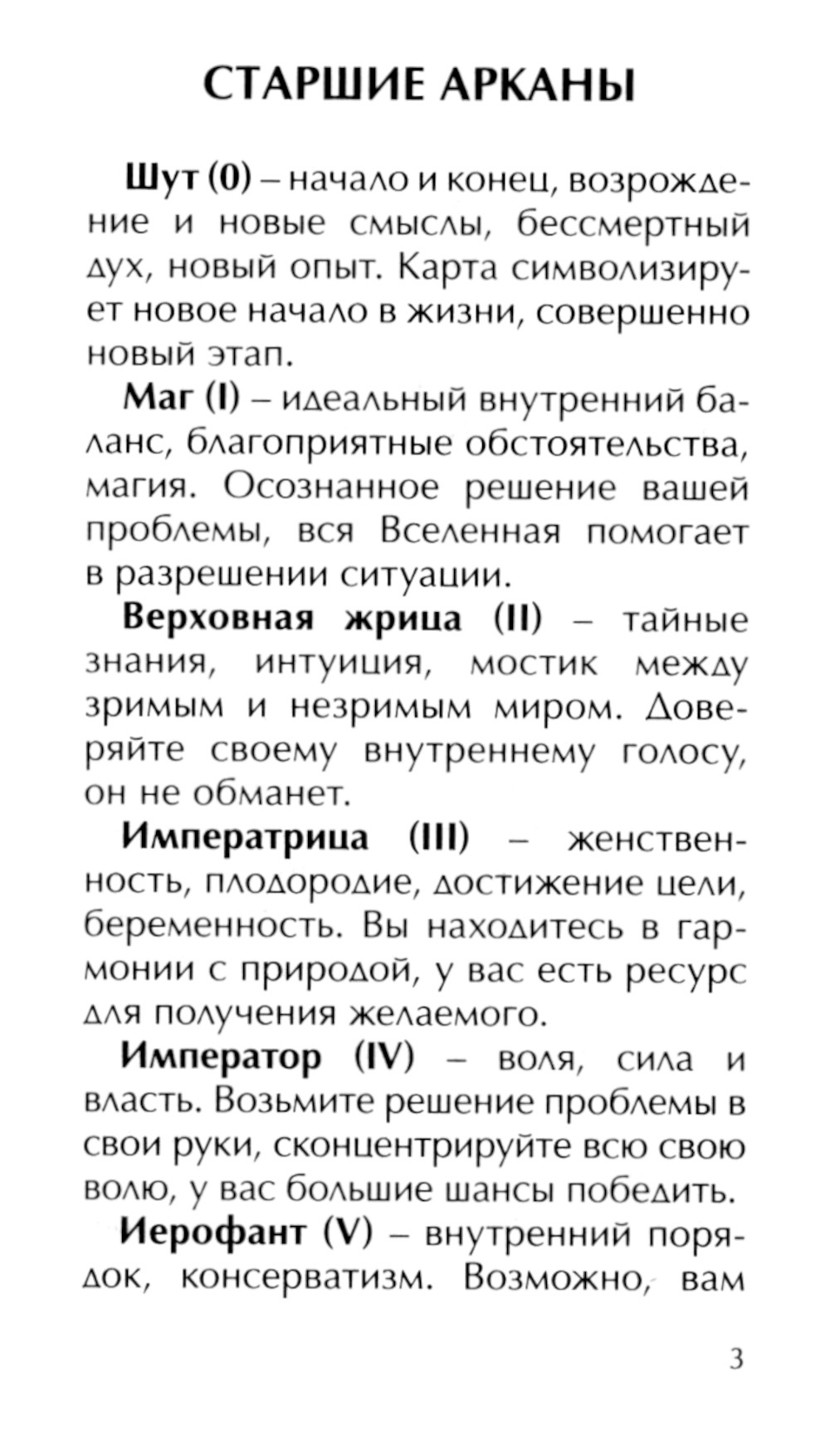 Колода Райдера-Уэйта включает в себя: 22 Старших аркана и 56 Младших арканов. Все карты имеют символические сюжетные рисунки, которые придают толкованиям особый смысл. При гаданиях и предсказаниях Старшие и Младшие арканы влияют на значения друг друга, смягчая или усиливая их. Старшие арканы говорят нам о глобальных событиях и переживаниях, а Младшие уточняют, то к чему такое положении вещей может привести.| Издательство | Рипол Классик |