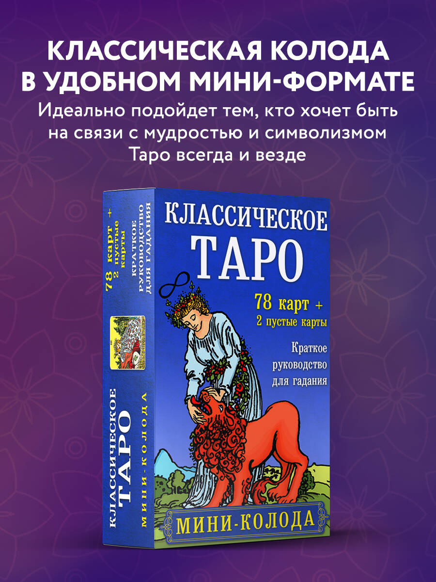 Обновленное издание классической колоды 1910 года в компактном и удобном миниатюрном формате станет верным и незаменимым спутником как начинающих, так и опытных тарологов. Набор «Классическое Таро. Мини-колода» включает в себя: • Компактную карманную колоду Таро из 78 карт с иллюстрациями 1910 года в свежем современном прочтении. • Две дополнительные «пустые» карты, расширяющие возможности работы с колодой и точность предсказания. • Краткое описание всех значений Старших и Младших арканов. Колода идеально подойдет всем, кто хочет быть на связи с мудростью и символизмом Таро всегда и везде.| Издательство | Эксмо |