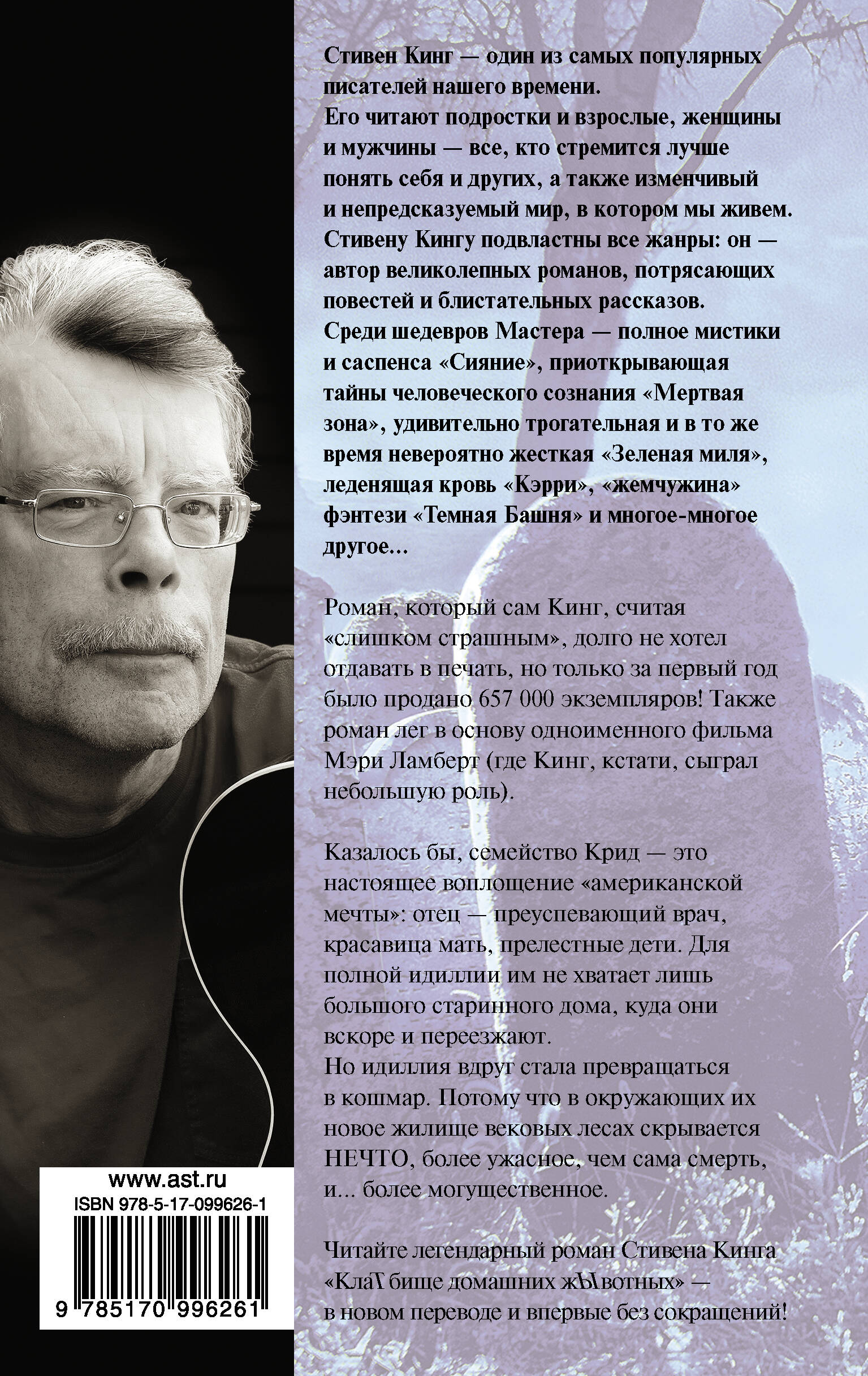 Роман, который сам Кинг, считая "слишком страшным", долго не хотел отдавать в печать, но только за первый год было продано 657 000 экземпляров! Также роман лег в основу одноименного фильма Мэри Ламберт (где Кинг, кстати, сыграл небольшую роль). Казалось бы, семейство Крид - это настоящее воплощение "американской мечты": отец - преуспевающий врач, красавица мать, прелестные дети. Для полной идиллии им не хватает лишь большого старинного дома, куда они вскоре и переезжают. Но идиллия вдруг стала превращаться в кошмар. Потому что в окружающих их новое жилище вековых лесах скрывается НЕЧТО, более ужасное, чем сама смерть и… более могущественное. Читайте легендарный роман Стивена Кинга "КлаТбище домашних жЫвотных" - в новом переводе и впервые без сокращений!| Издательство | ИЗДАТЕЛЬСТВО "АСТ" |
