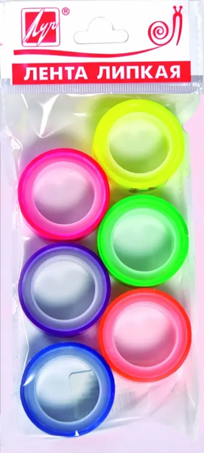В комплекте пять роликов ленты ярких флуоресцентных цветов, упакованных в пакет