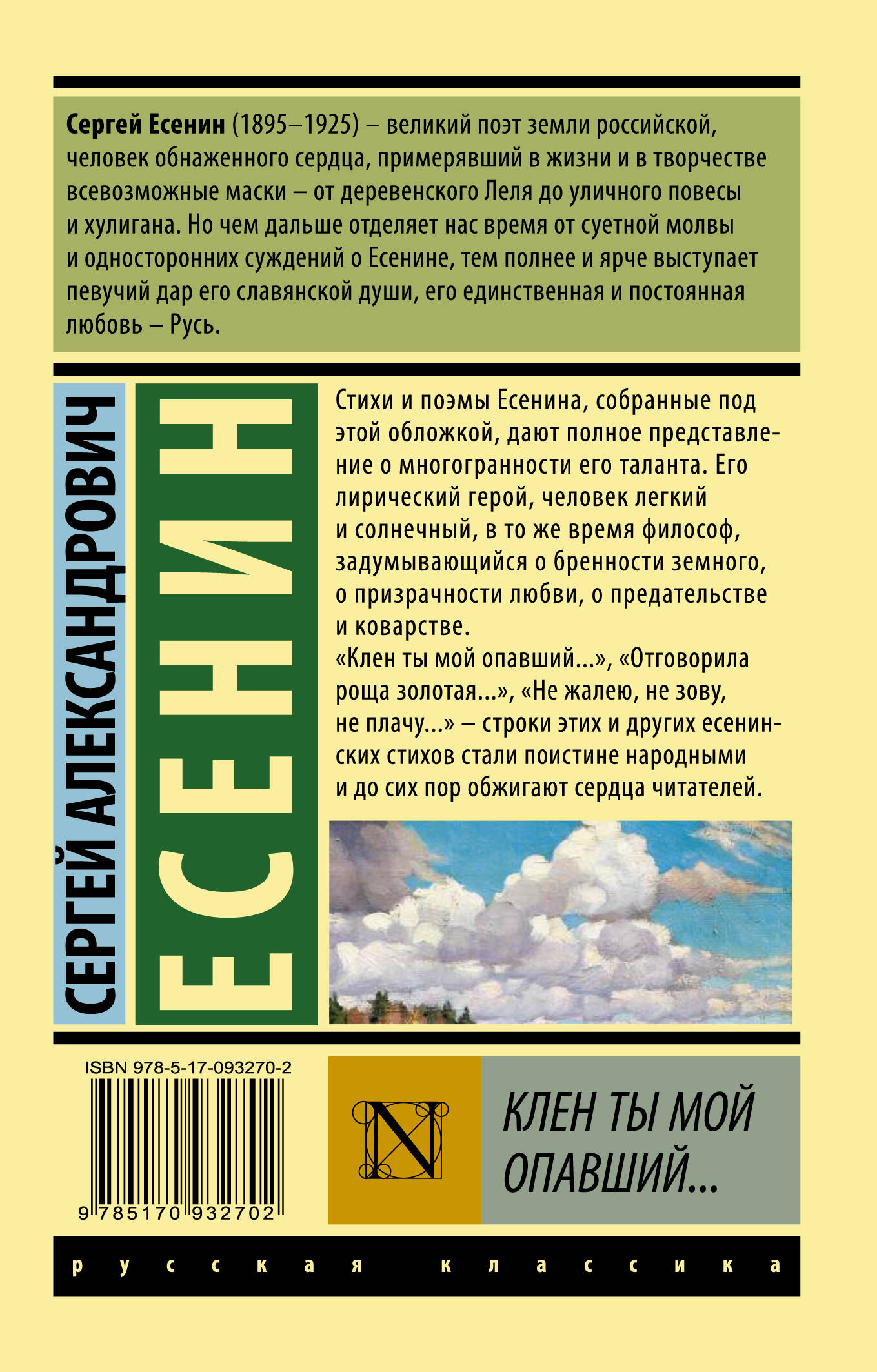 Стихи и поэмы Есенина, собранные под этой обложкой, дают полное представление о многогранности его таланта. Его лирический герой, человек легкий и солнечный, в то же время философ, задумывающийся о бренности земного, о призрачности любви, о предательстве и коварстве. "Клен ты мой опавший…", "Отговорила роща золотая…", "Не жалею, не зову, не плачу…" - строки этих и других есенинских стихов стали поистине народными и до сих пор обжигают сердца читателей.| Издательство | ИЗДАТЕЛЬСТВО "АСТ" |