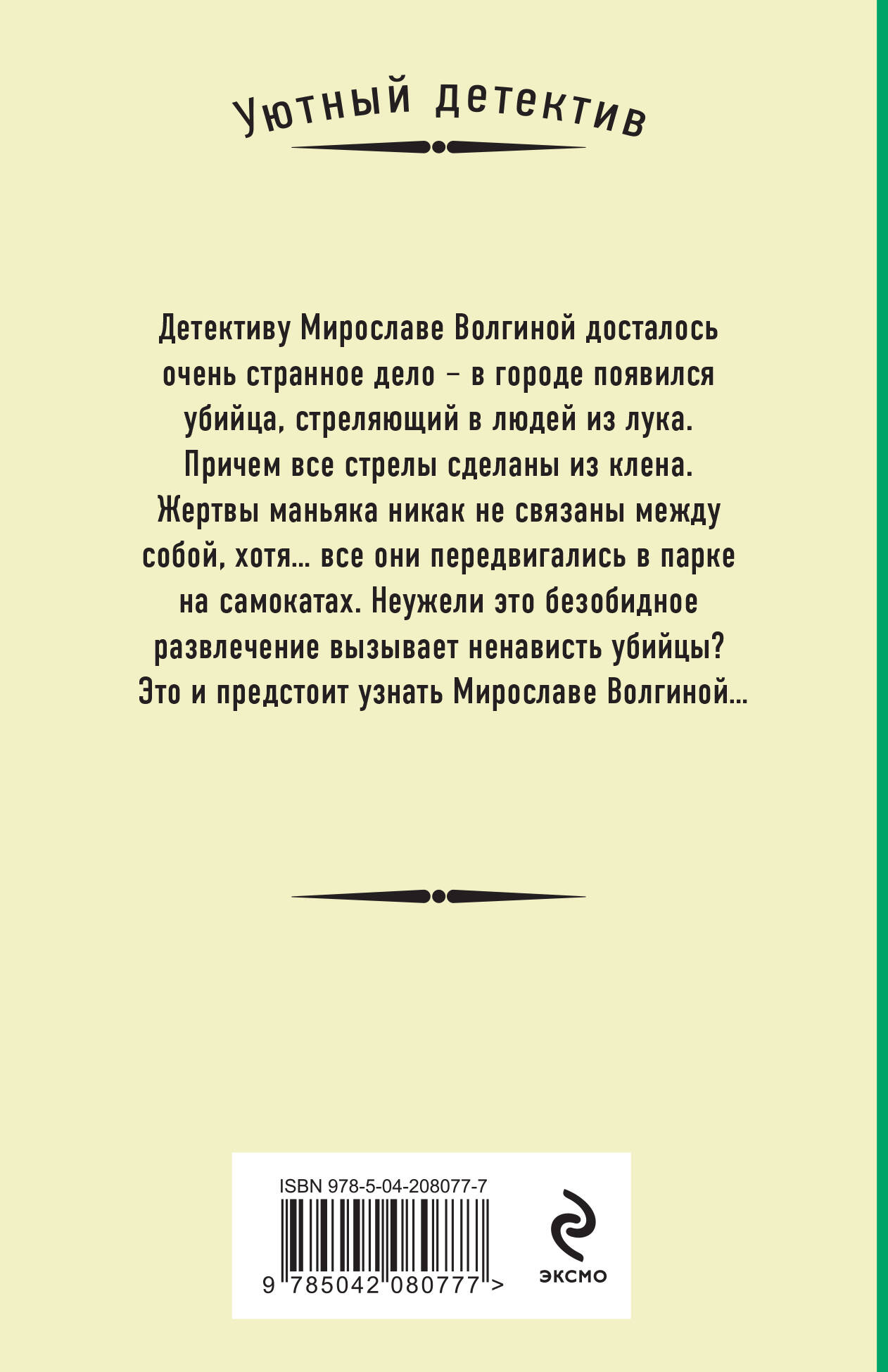 Детективу Мирославе Волгиной досталось очень странное дело - в городе появился убийца, стреляющий в людей из лука. Причем все стрелы сделаны из клена. Жертвы маньяка никак не связаны между собой, хотя… все они передвигались в парке на самокатах. Неужели это безобидное развлечение вызывает ненависть убийцы? Это и предстоит узнать Мирославе Волгиной…| Издательство | ООО "Издательство "Эксмо" |