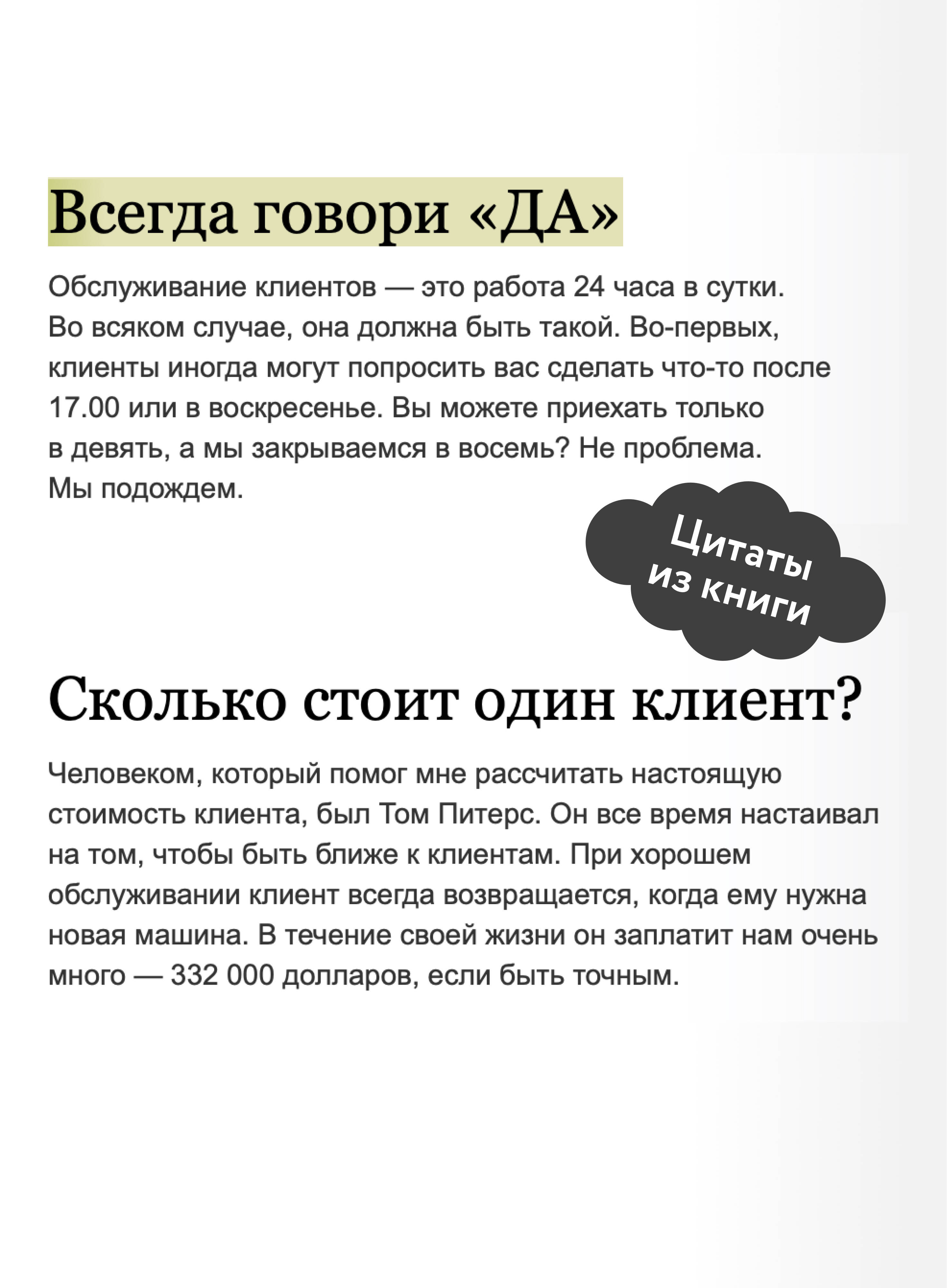 Практическое руководство от Карла Сьюэлла, СЕО одной из лучших автодилерских компаний США, которое поможет удержать имеющихся клиентов и привлечь новых. Карл Сьюэлл - лучший автодилер Америки, успешный бизнесмен, которому удалось поднять продажи до невиданных высот благодаря привлечению и удержанию покупателей. Его книга являет собой практическое руководство по работе с клиентами (а попутно и по организации работы предприятия, маркетингу и мерчендайзингу). Сьюэлл рекомендует всем делать ставку на постоянных клиентов, поскольку настрой на разовые продажи делает бизнес неустойчивым. И убедительно доказывает: чтобы удержать клиента, необходимо пересмотреть свои взгляды не только на обслуживание как таковое, но и на организацию работы, оплату труда, чистоту помещений, дизайн ландшафта и многие другие мелочи. Рекомендации подойдут любой компании. В каждой главе вы найдете практические советы для вашего бизнеса, будь то торговля автомобилями, модной одеждой или банковские услуги. Для кого эта книга: Книга будет полезна как тем, кто только начинает свое дело, так и тем, кто хочет создать лояльное коммьюнити своего бизнеса. Фишка книги: Это любимая книга Тома Питерса - самого влиятельного представителя деловой мысли нашего времени, который заслужил титул гуру для гуру управленческой науки. Награды книги: Лучшая книга о практике удержания клиентов в рейтинге журнала "Маркетинг PRO". Второе место в рейтинге "Лучшие книги для предпринимателей" журнала "Свой Бизнес" в категории "Бизнес-знания". Лучшая книга в номинации "Бизнес-рецепты" по версии журнала "Свой бизнес".