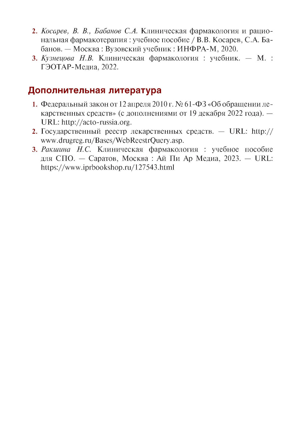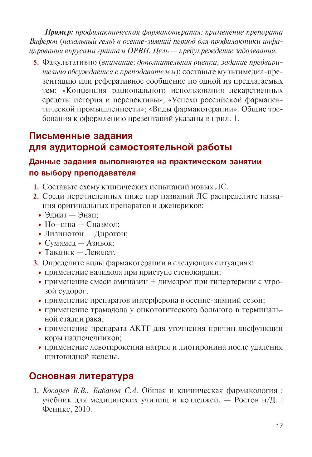 Предназначено для подготовки к практическим занятиям и содержит рекомендации по изучению теоретического материала, а также задания в различных формах, способствующие освоению общих и профессиональных компетенций, развитию творческого мышления и самостоятельности будущих медицинских работников среднего звена. Соответствует ФГОС СПО последнего поколения. Для организации различных форм самостоятельной работы студентов, получающих среднее профессиональное образование в колледжах и училищах медицинского и фармацевтического профилей по дисциплине «Клиническая фармакология».| Издательство | КноРус |