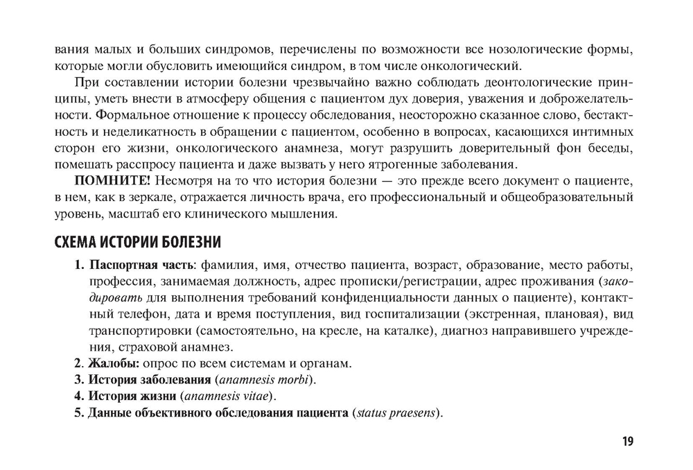 В руководстве представлены методические подходы к клиническому обследованию пациента и последовательность их описания в соответствии с унифицированной схемой истории болезни для оформления медицинской карты стационарного больного; перечень рекомендуемых лабораторно-инструментальных методов обследования пациента в обще профессиональной клинике; латинская медицинская терминология состояний. Рекомендован примерный перечень дополнительных лабораторных и инструментальных методов обследования пациентов при некоторых заболеваниях внутренних органов в соответствии с требованиями стандартов ведения онкологических больных. Приведены основные нормативные показатели лабораторно-инструментальных методов исследования и речевые модули для медицинской практики. Издание предназначено специалистам первичного звена здравоохранения, врачам-онкологам, слушателям академий и кафедр последипломного образования, а также студентам медицинских вузов.
