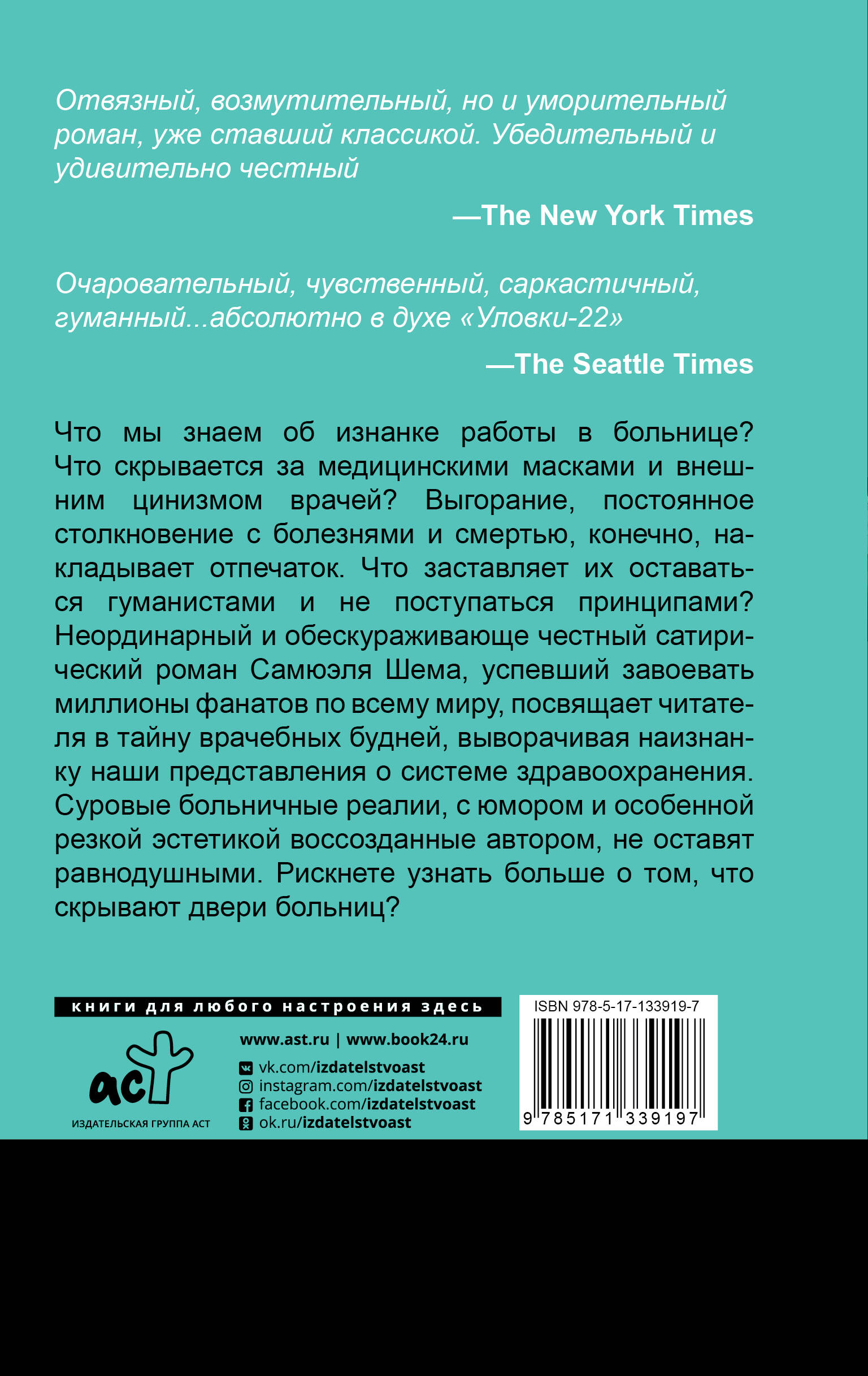 Отвязный, возмутительный, но и уморительный роман, уже ставший классикой. Убедительный и удивительно честный -The New York Times Очаровательный, чувственный, саркастичный, гуманный...абсолютно в духе "Уловки-22" -The Seattle Times Что мы знаем об изнанке работы в больнице? Что скрывается за медицинскими масками и внешним цинизмом врачей? Выгорание, постоянное столкновение с болезнями и смертью, конечно, накладывает отпечаток. Что заставляет их оставаться гуманистами и не поступаться принципами? Неординарный и обескураживающе честный сатирический роман Самюэля Шема, успевший завоевать миллионы фанатов по всему миру, посвящает читателя в тайну врачебных будней, выворачивая наизнанку наши представления о системе здравоохранения. Суровые больничные реалии, с юмором и особенной резкой эстетикой воссозданные автором, не оставят равнодушными. Рискнете узнать больше о том, что скрывают двери больниц?| Издательство | ИЗДАТЕЛЬСТВО "АСТ" |