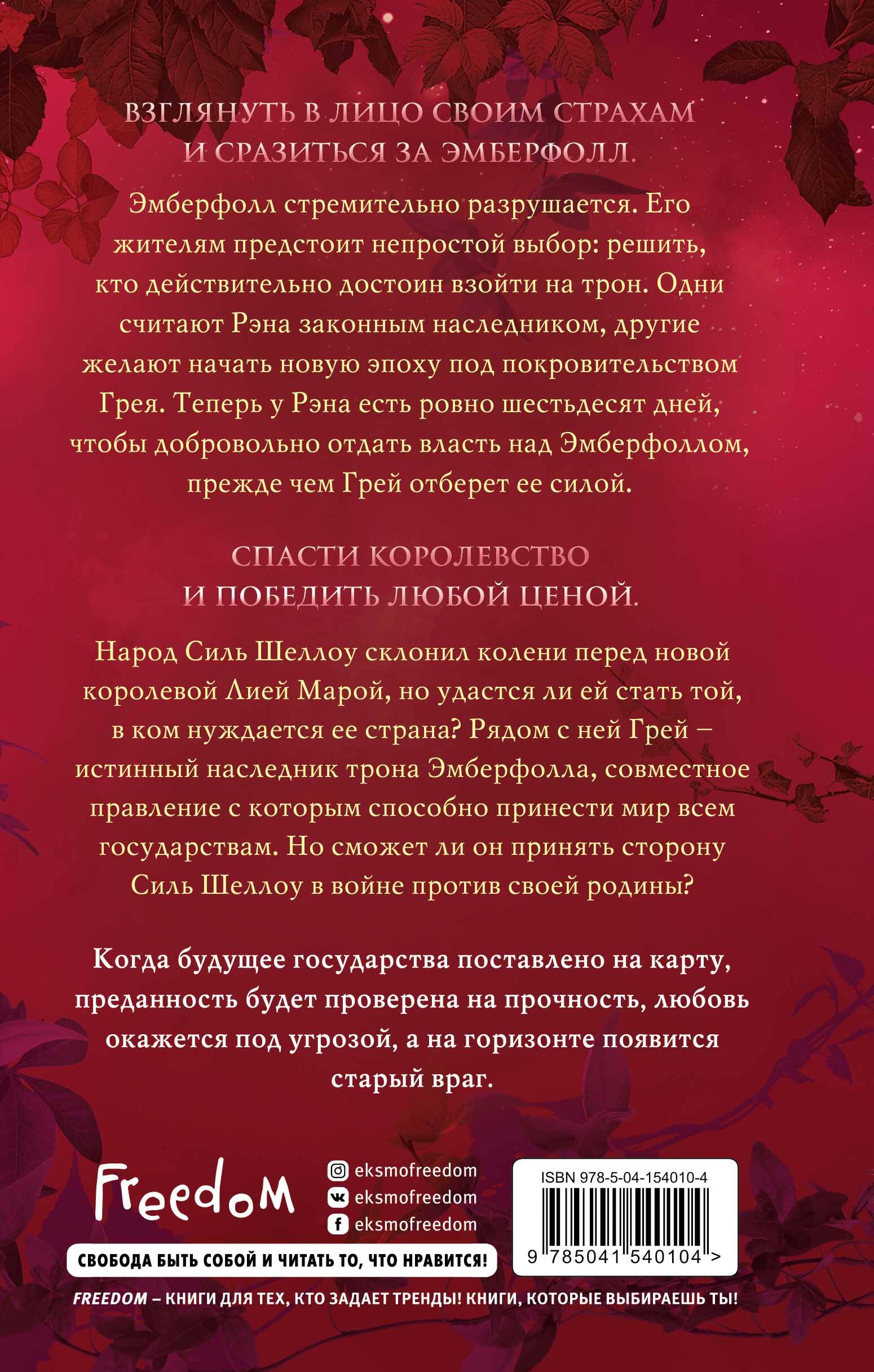 Взглянуть в лицо своим страхам и сразиться за Эмберфолл. Эмберфолл стремительно разрушается. Его жителям предстоит непростой выбор: решить, кто действительно достоин взойти на трон. Одни считают Рэна законным наследником, другие желают начать новую эпоху под покровительством Грея. Теперь у Рэна есть ровно шестьдесят дней, чтобы добровольно отдать власть над Эмберфоллом, прежде чем Грей отберет ее силой. Спасти королевство и победить любой ценой. Народ Силь Шеллоу склонил колени перед новой королевой Лией Марой, но удастся ли ей стать той, в ком нуждается ее страна? Рядом с ней Грей - истинный наследник трона Эмберфолла, совместное правление с которым способно принести мир всем государствам. Но сможет ли он принять сторону Силь Шеллоу в войне против своей родины? Когда будущее государства поставлено на карту, преданность будет проверена на прочность, любовь окажется под угрозой, а на горизонте появится старый враг. Завершающая часть бестселлеров New York Times от американской писательницы Бриджит Кеммерер. Союз между Силь Шеллоу и Эмберфоллом невозможен. Остается только одно - война. Друзья в прошлом - враги в настоящем встретятся в последней битве, которая может закончиться для всех большими потерями. Чью сторону выберет Грей и какой финал уготовлен им обоим? Более 58 тыс. человек добавили книгу в раздел «Хочу прочитать», 12 тыс. оценок на Goodreads Карта Эмберфолла позволит еще больше погрузиться в чарующую атмосферу и лучше узнать мир любимых героев. Новый взгляд на любимую сказку «Красавица и Чудовище»: она - простая девушка из Вашингтона, он - наследный принц Эмберфолла, и один шаг способен разрушить завесу их миров. «Романтика, интриги, измены, неожиданные повороты сюжета. Прекрасно проработанный мир со всеми персонажами». - Amazon