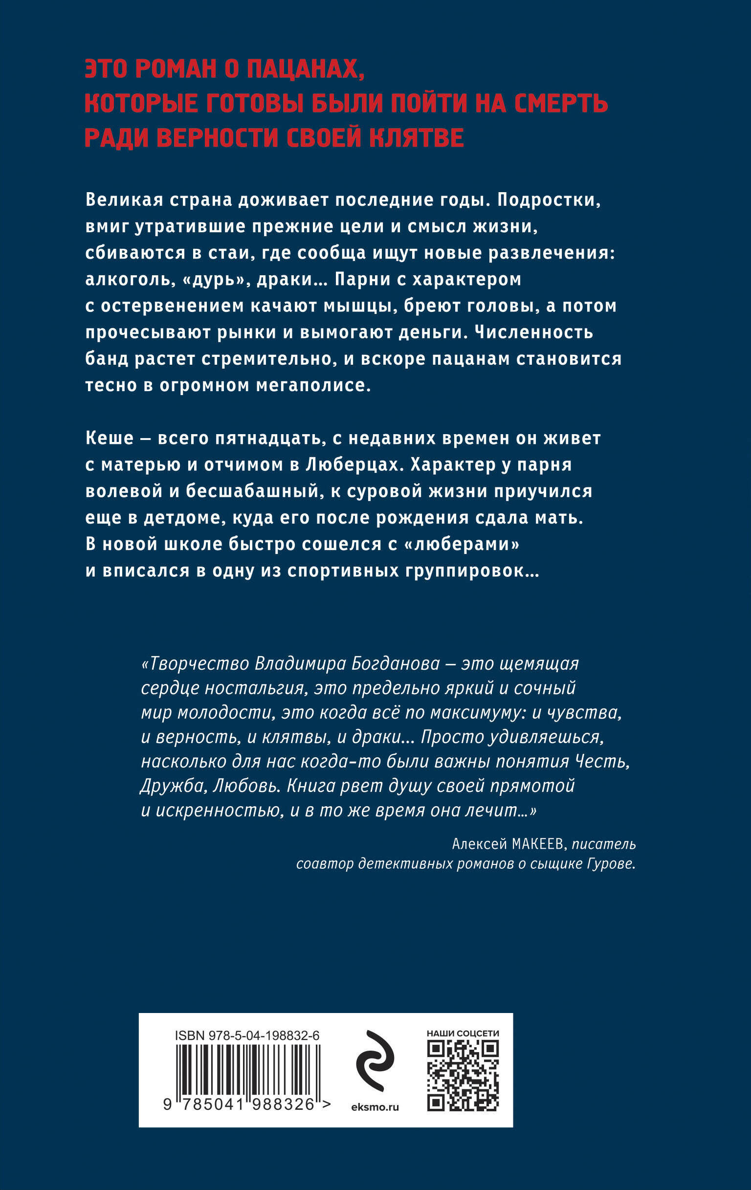 ЭТО РОМАН О ПАЦАНАХ, КОТОРЫЕ ГОТОВЫ БЫЛИ ПОЙТИ НА СМЕРТЬ РАДИ ВЕРНОСТИ СВОЕЙ КЛЯТВЕ. Великая страна доживает последние годы. Подростки, вмиг утратившие прежние цели и смысл жизни, сбиваются в стаи, где сообща ищут новые развлечения: алкоголь, «дурь», драки… Парни с характером с остервенением качают мышцы, бреют головы, а потом прочесывают рынки и вымогают деньги. Численность банд растет стремительно, и вскоре пацанам становится тесно в огромном мегаполисе. Кеше всего пятнадцать, с недавних времен он живет с матерью и отчимом в Люберцах. Характер у парня волевой и бесшабашный, к суровой жизни приучился еще в детдоме, куда его после рождения сдала мать. В новой школе быстро сошелся с «люберами» и вписался в одну из спортивных группировок… Автор романа Владимир Богданов, чья молодость и юность пришлись на годы развала Советского Союза, крушения морали и нравов, ценностей и жизненных идеалов, прошел через драматические испытания в молодежной группировке, где познал и дружбу, и предательство, и верность слову, и любовь. ------------------------------ «Творчество Владимира Богданова - это щемящая сердце ностальгия, это предельно яркий и сочный мир молодости, это когда всё по максимуму: и чувства, и верность, и клятвы, и драки... Просто удивляешься, насколько для нас когда-то были важны понятия Честь, Дружба, Любовь. Книга рвет душу своей прямотой и искренностью, и в то же время она лечит…» - Алексей МАКЕЕВ, писатель, соавтор детективных романов о сыщике Гурове| Издательство | ООО "Издательство "Эксмо" |
