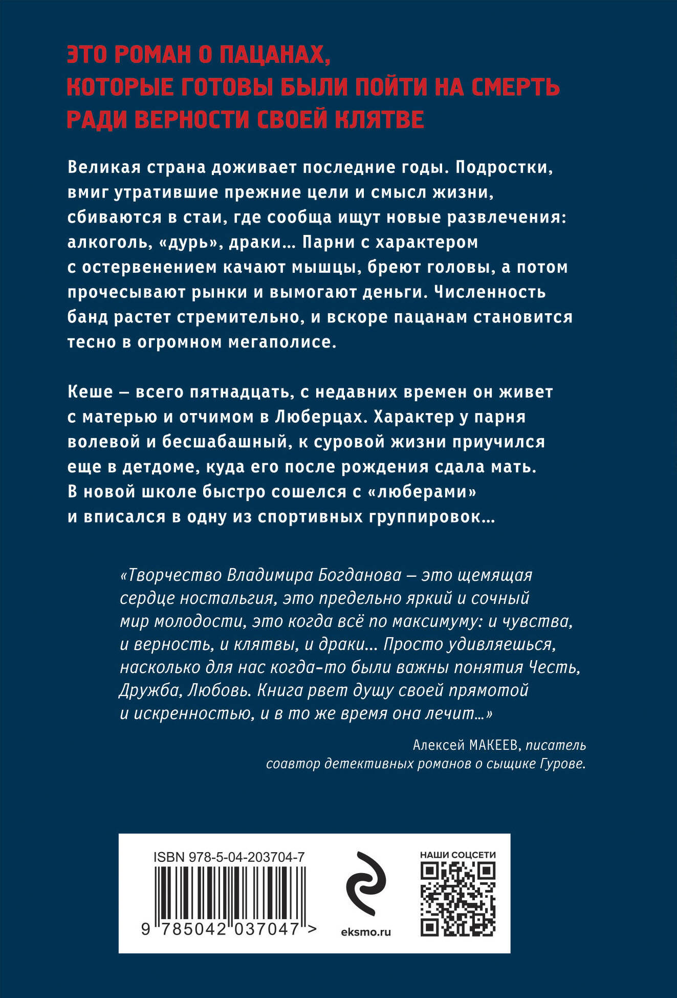 ЭТО РОМАН О ПАЦАНАХ, КОТОРЫЕ ГОТОВЫ БЫЛИ ПОЙТИ НА СМЕРТЬ РАДИ ВЕРНОСТИ СВОЕЙ КЛЯТВЕ. Великая страна доживает последние годы. Подростки, вмиг утратившие прежние цели и смысл жизни, сбиваются в стаи, где сообща ищут новые развлечения: алкоголь, «дурь», драки… Парни с характером с остервенением качают мышцы, бреют головы, а потом прочесывают рынки и вымогают деньги. Численность банд растет стремительно, и вскоре пацанам становится тесно в огромном мегаполисе. Кеше всего пятнадцать, с недавних времен он живет с матерью и отчимом в Люберцах. Характер у парня волевой и бесшабашный, к суровой жизни приучился еще в детдоме, куда его после рождения сдала мать. В новой школе быстро сошелся с «люберами» и вписался в одну из спортивных группировок… Автор романа Владимир Богданов, чья молодость и юность пришлись на годы развала Советского Союза, крушения морали и нравов, ценностей и жизненных идеалов, прошел через драматические испытания в молодежной группировке, где познал и дружбу, и предательство, и верность слову, и любовь. ------------------------------ «Творчество Владимира Богданова - это щемящая сердце ностальгия, это предельно яркий и сочный мир молодости, это когда всё по максимуму: и чувства, и верность, и клятвы, и драки... Просто удивляешься, насколько для нас когда-то были важны понятия Честь, Дружба, Любовь. Книга рвет душу своей прямотой и искренностью, и в то же время она лечит…» - Алексей МАКЕЕВ, писатель, соавтор детективных романов о сыщике Гурове| Издательство | ООО "Издательство "Эксмо" |