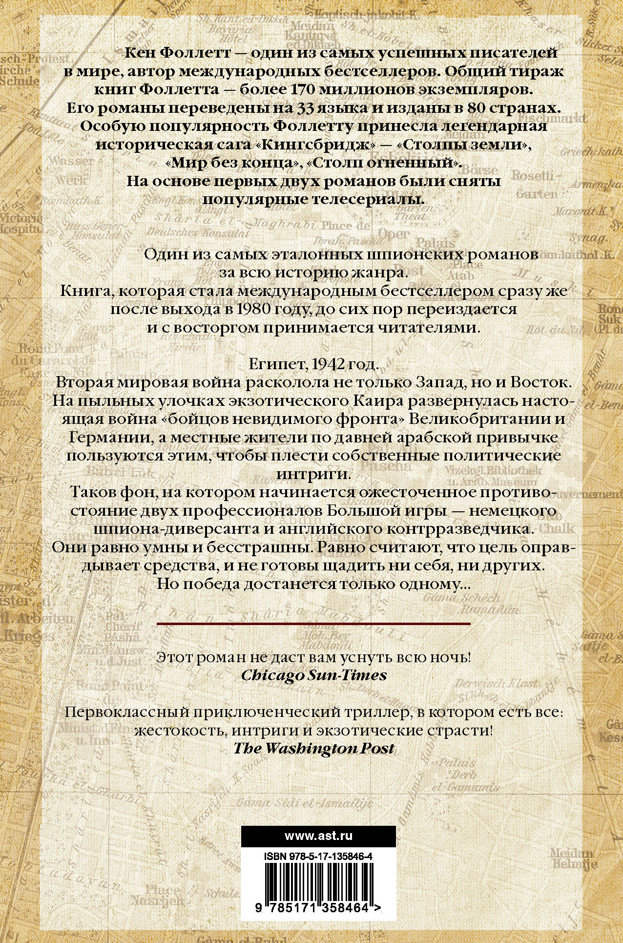 Кен Фоллетт - автор легендарного цикла «Кингсбридж» с тиражом в 12 000 000 экземпляров. «Ключ к Ребекке» был экранизирован и вошел в Топ-100 детективных романов всех времён по версии Британской ассоциации писателей детективов (CWA). Египет, 1942‑й год. Вторая Мировая война расколола на только Запад, но и Восток. На пыльных улочках экзотического Каира развернулась настоящая война «бойцов невидимого фронта» Великобритании и Германии, а местные жители, по давней арабской привычке, пользуются этим, чтобы плести собственные политические интриги. Таков фон, на котором начинается ожесточенное противостояние двух профессионалов Большой игры - немецкого шпиона‑диверсанта и английского контрразведчика. Они равно умны и бесстрашны. Равно считают, что цель оправдывает средства, и не готовы щадить ни себя, ни других. Но победа достанется только одному...| Издательство | АСТ |