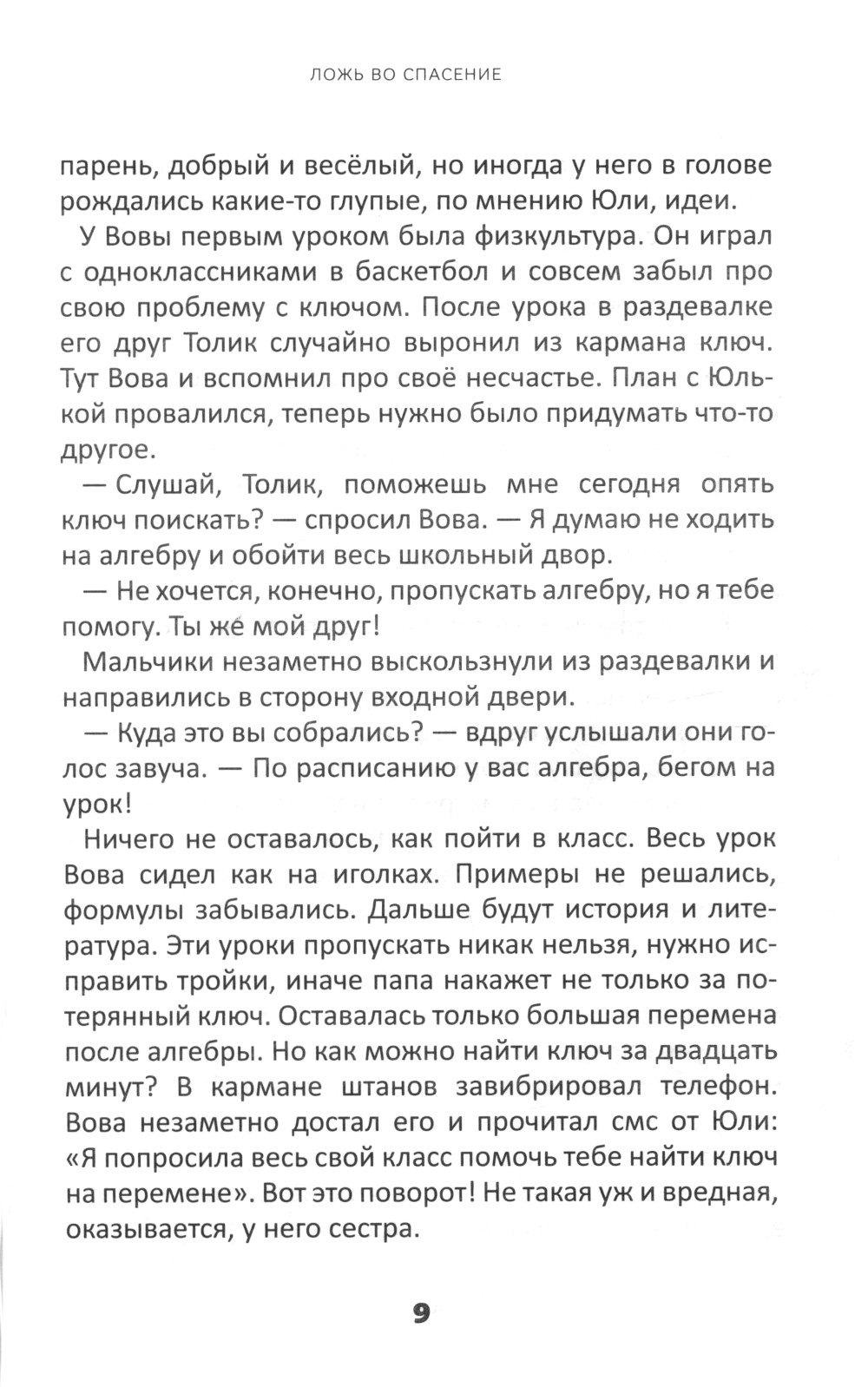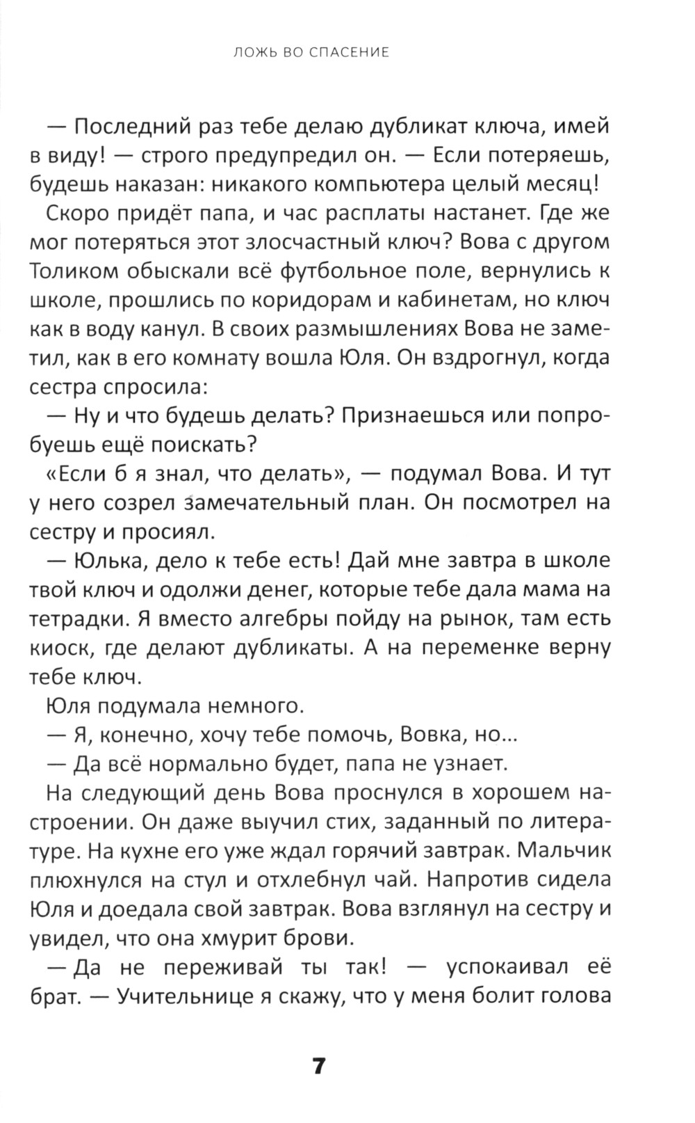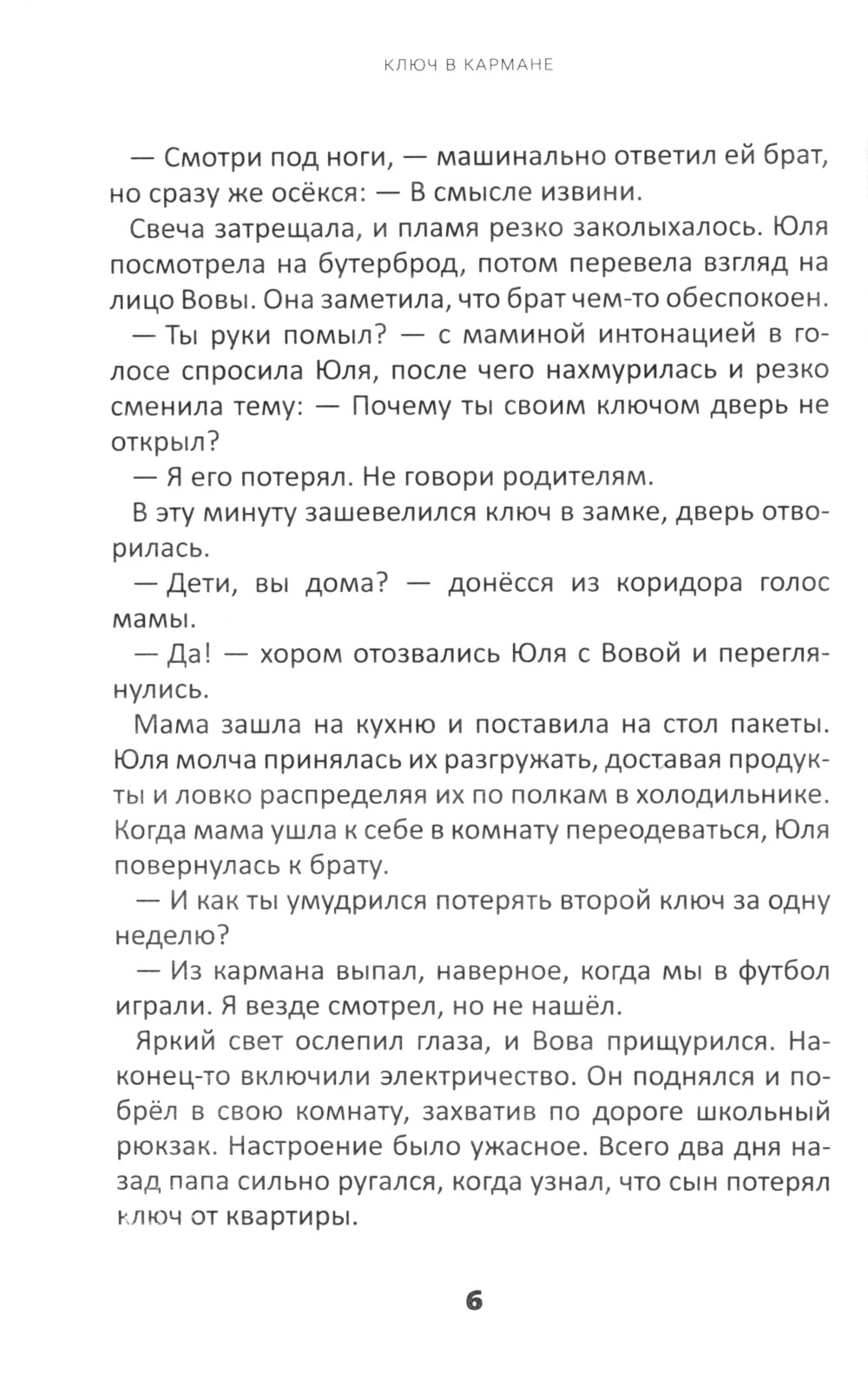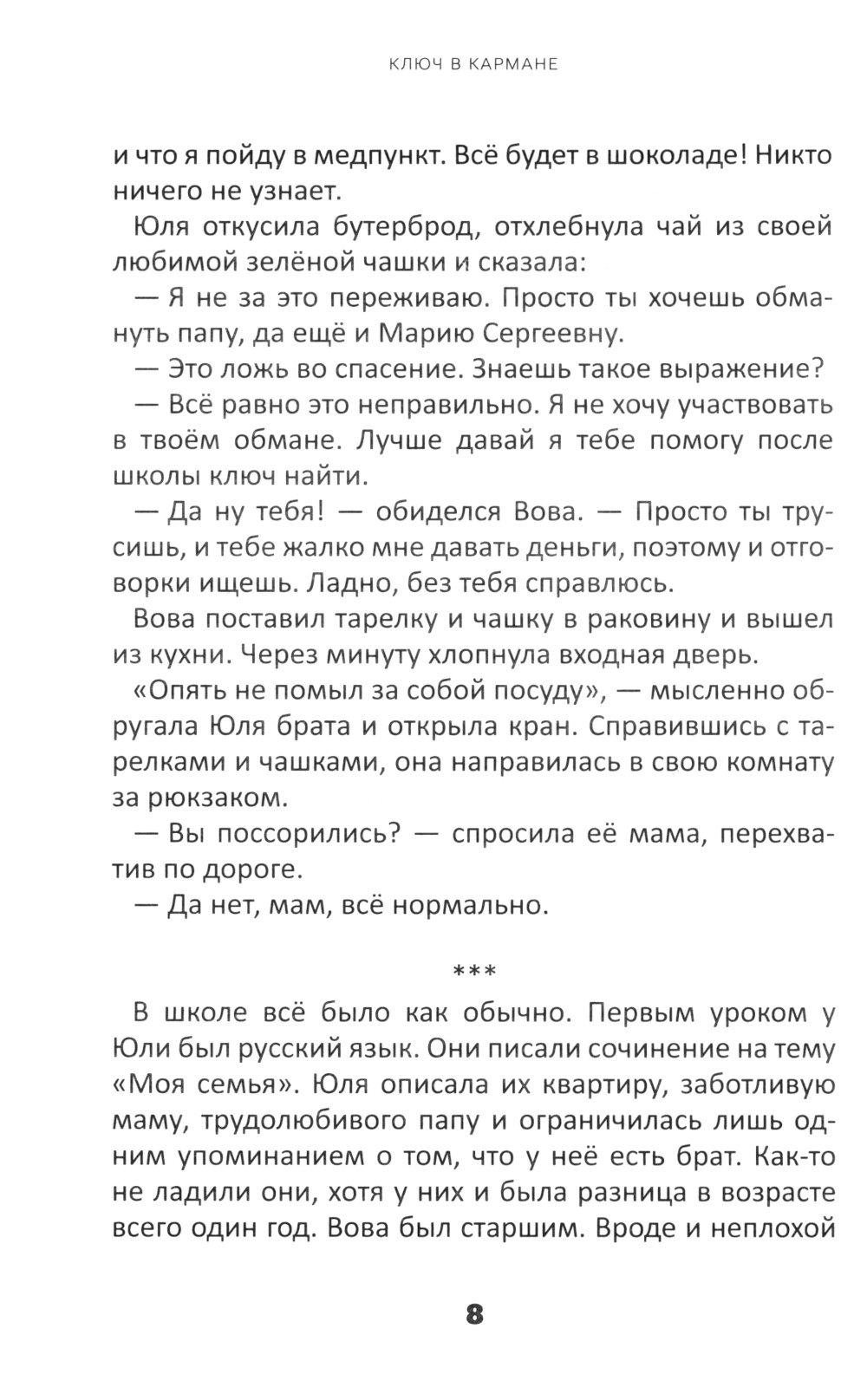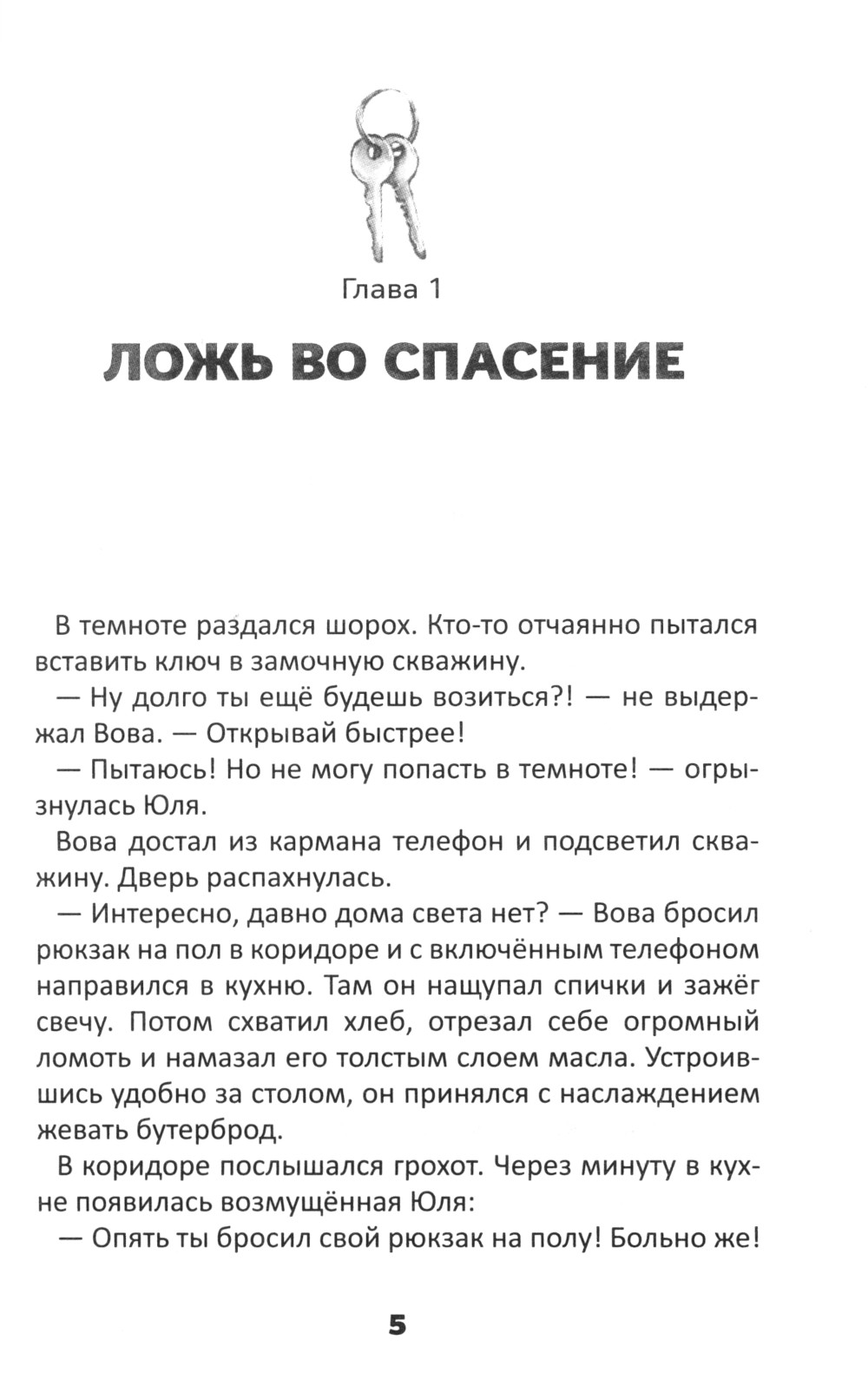 Главные герои книги - 12-летняя Юля и её старший брат Вова. Начинается повествование с того, что рассеянный Вова уже второй раз за неделю теряет ключ от квартиры. Он боится признаться в этом отцу из-за наказания, поэтому пытается уговорить сестру помочь ему осуществить хитрый план - он прогуляет алгебру, возьмёт у неё денег и пойдёт на рынок, чтобы сделать дубликат ключа. Родители ничего не узнают, уверяет он сестру. Юля оказывается перед дилеммой: солгать и спасти брата от наказания или всё рассказать родителям, но тогда Вова на неё обидится... С такими мыслями брат с сестрой отправляются в школу. Позже ключ найдётся в кармане куртки Вовы, Юля обрадуется, что не выбрала путь лжи во спасение, и жизнь пойдёт своим чередом. Герои книги и их друзья переживут много событий, горестей и радостей, познакомятся с новичком Стасом, переехавшим в их район. От него они узнают, что Бог реален и слышит молитвы, он научит их самих обращаться к Богу в трудную минуту. И когда Стас попадет в беду, его друзья впервые объединятся в молитве за своего друга. Как потерянный ключ был обнаружен в кармане куртки, так и забытые библейские истины о честности. Божьей любви, вере, силе молитвы и помощи другим постепенно раскрываются на страницах книги в жизни её героев.| Издательство | Источник жизни |