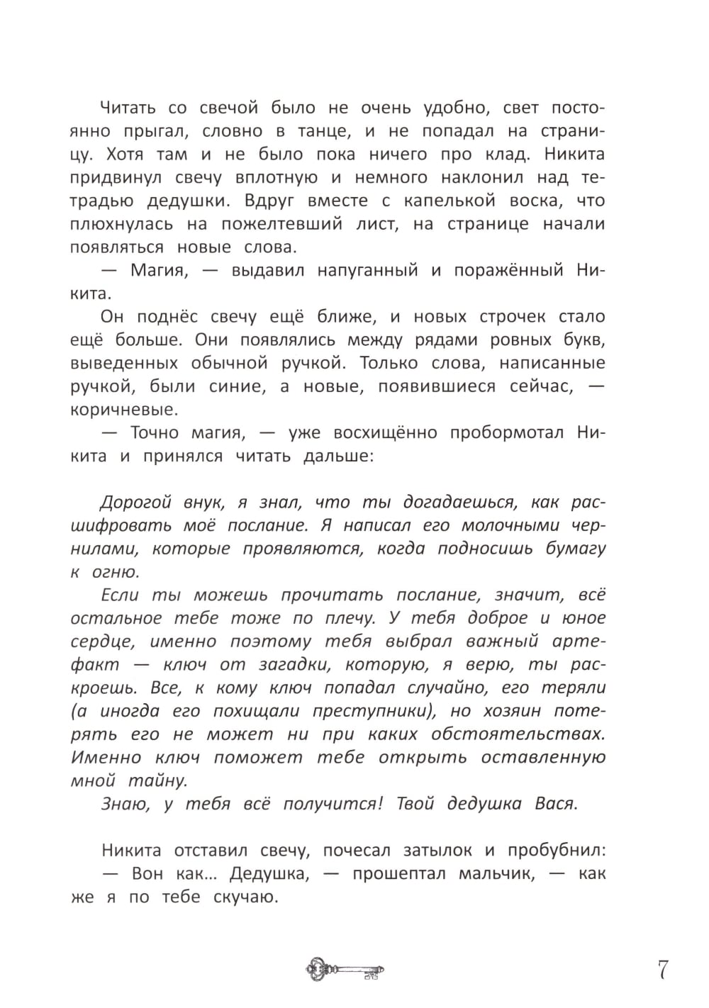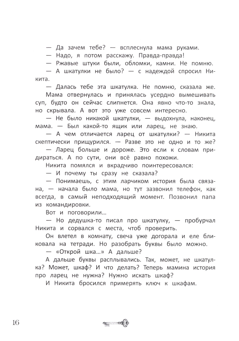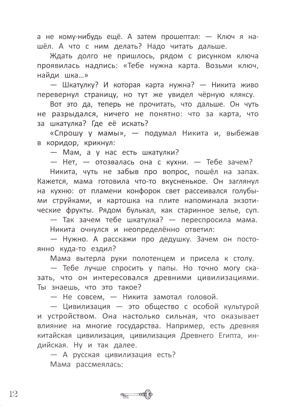 Никита Котиков получает в наследство от дедушки дневник, полный таинственных загадок. В нём герой находит письмо, в котором дедушка просит Никиту раскрыть его последнюю тайну и опередить чёрных копателей, также преследующих артефакт. По счастливому стечению обстоятельств герой вместе с родителями отправляется к бабушке, у которой и находится подсказка из дневника. С каждым шагом Никита и его семья приближаются не только к разгадке дедушкиной тайны, но и к опасностям, которые эта тайна в себе несёт.| Издательство | Феникс |