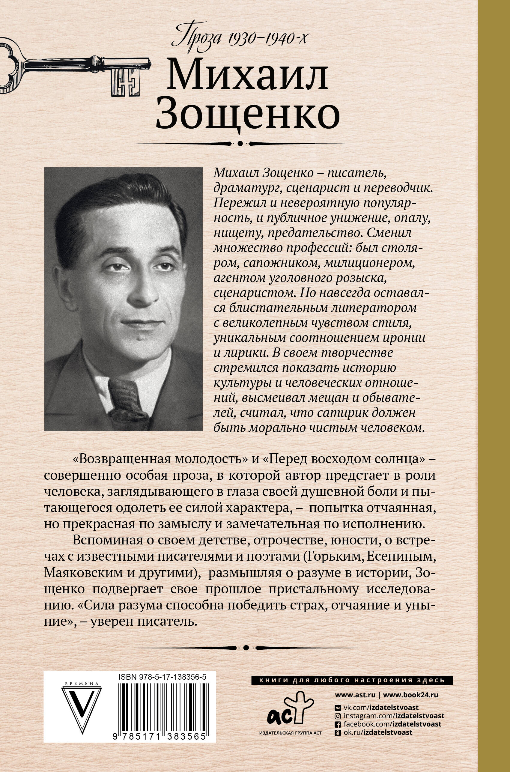 Михаил Зощенко - писатель, драматург, сценарист и переводчик. Пережил и невероятную популярность, и публичное унижение, опалу, нищету, предательство. Сменил множество профессий: был столяром, сапожником,милиционером, агентом уголовного розыска, сценаристом. Но навсегда остал- ся блистательным литератором с великолепным чувством стиля, уникальным соотношением иронии и лирики. В своем творчестве стремился показать историю культуры и человеческих отношений, высмеивал мещан и обывате- лей, считал, что сатирик должен быть морально чистым человеком. "Возращенная молодость" и "Перед восходом солнца" - совершенно особая проза, в которой автор предстает в роли человека, заглядывающего в глаза своей душевной боли и пытающегося одолеть ее силой характера, - попытка отчаянная, но прекрасная по замыслу и замечательная по исполнению. Вспоминая о своем детстве, отрочестве, юности, о встречах с известными писателями и поэтами (Горьким, Есениным, Маяковским и другими), размышляя о разуме в истории, Зощенко подвергает свое прошлое пристальному исследованию.| Издательство | ИЗДАТЕЛЬСТВО "АСТ" |