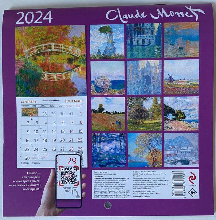 О серии: Наши настенные календари отличаются высоким качеством исполнения! Тщательно подобранные иллюстрации, напечатанные на глянцевой бумаге высочайшего качества, станут настоящим украшением дома, а в календарной сетке найдется место для ваших планов: большие клетки позволят делать записи и организовать свой год! В календаре также отмечены все государственные праздники. В серии настенных календарей издательства «ЭКСМО» каждый найдет тему по вкусу: великие художники, великолепные подборки с самыми знаменитыми произведениями искусства, легендарные кинематографические саги и игры, главные книжные авторы и бестселлеры, фотографии и иллюстрации любимых животных и многое-многое другое! О календаре: Практичный и эстетичный, этот календарь каждый месяц будет радовать вас. Прекрасные картины органично дополнят любой интерьер и помогут планировать время. В этом календаре представлены шедевры кисти Клода Моне. Для кого: Высокое качество полиграфического исполнения прекрасно дополняет репродукции шедевров живописи, что непременно будет по достоинству оценено людьми с хорошим вкусом. Технические параметры: - Тип календаря - настенный перекидной. - Год - 2024. - Календарная сетка - с разбивкой по месяцам. - Вид скрепления - скрепка. - Ширина - 17 см. - Высота - 17 см. - Внутренний блок - мелованная бумага 150 г/м2. - Подложка - плотный гофрокартон для поддержания формы. - Индивидуальная упаковка в плотный целлофановый пакет.| Издательство | ООО "Издательство "Эксмо" |