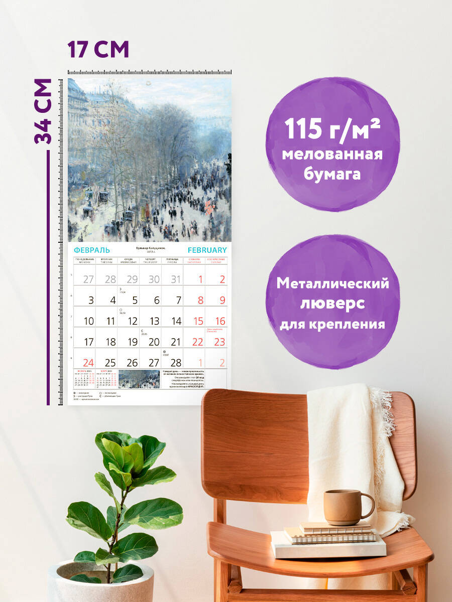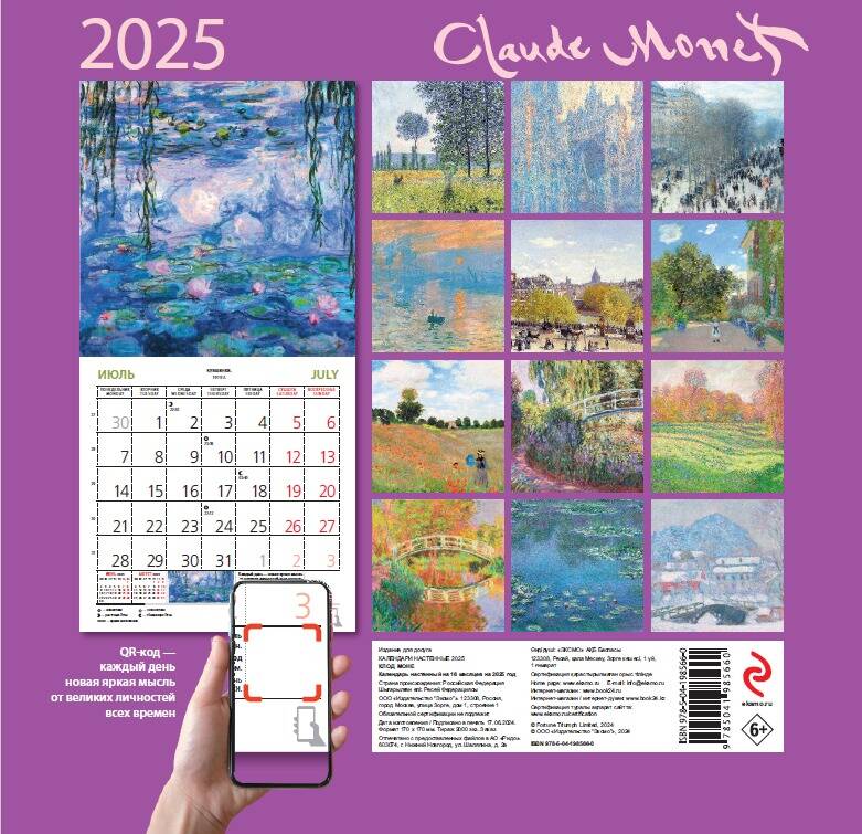 О серии: Наши настенные календари отличаются высоким качеством исполнения! Тщательно подобранные иллюстрации, напечатанные на глянцевой бумаге высочайшего качества, станут настоящим украшением дома, а в календарной сетке найдется место для ваших планов: большие клетки позволят делать записи и организовать свой год! В календаре также отмечены все государственные праздники. В серии настенных календарей издательства «ЭКСМО» каждый найдет тему по вкусу: великие художники, великолепные подборки с самыми знаменитыми произведениями искусства, легендарные кинематографические саги и игры, главные книжные авторы и бестселлеры, фотографии и иллюстрации любимых животных и многое-многое другое! О календаре: Практичный и эстетичный, этот календарь каждый месяц будет радовать вас. Прекрасные картины органично дополнят любой интерьер и помогут планировать время. В этом календаре представлены шедевры кисти Клода Моне. Для кого: Высокое качество полиграфического исполнения прекрасно дополняет репродукции шедевров живописи, что непременно будет по достоинству оценено людьми с хорошим вкусом. Технические параметры: Тип календаря - настенный перекидной Год - 2025 Календарная сетка - с разбивкой по месяцам Вид скрепления - скрепка Ширина - 17 см Высота - 17 см Внутренний блок - мелованная бумага 130 г/м2 Подложка - плотный гофрокартон для поддержания формы Индивидуальная упаковка в плотный целлофановый пакет.| Издательство | ООО "Издательство "Эксмо" |