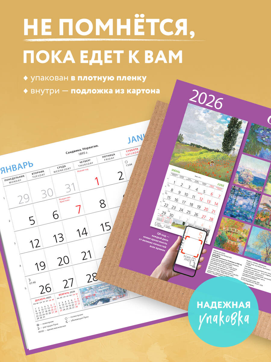 О серии: Наши настенные календари отличаются высоким качеством исполнения! Тщательно подобранные иллюстрации, напечатанные на глянцевой бумаге высочайшего качества, станут настоящим украшением дома, а в календарной сетке найдется место для ваших планов: большие клетки позволят делать записи и организовать свой год! В календаре также отмечены все государственные праздники. В серии настенных календарей издательства «ЭКСМО» каждый найдет тему по вкусу: великие художники, великолепные подборки с самыми знаменитыми произведениями искусства, легендарные кинематографические саги и игры, главные книжные авторы и бестселлеры, фотографии и иллюстрации любимых животных и многое-многое другое! О календаре: Практичный и эстетичный, этот календарь каждый месяц будет радовать вас. Прекрасные картины органично дополнят любой интерьер и помогут планировать время. В этом календаре представлены шедевры кисти Клода Моне. Для кого: Высокое качество полиграфического исполнения прекрасно дополняет репродукции шедевров живописи, что непременно будет по достоинству оценено людьми с хорошим вкусом. Технические параметры: - Тип календаря - настенный перекидной. - Год - 2026. - Календарная сетка - с разбивкой по месяцам. - Вид скрепления - скрепка. - Ширина - 17 см. - Высота - 17 см. - Внутренний блок - мелованная бумага 130 г/м2. - Подложка - плотный гофрокартон для поддержания формы. - Индивидуальная упаковка в плотный целлофановый пакет.| Издательство | ООО "Издательство "Эксмо" |
