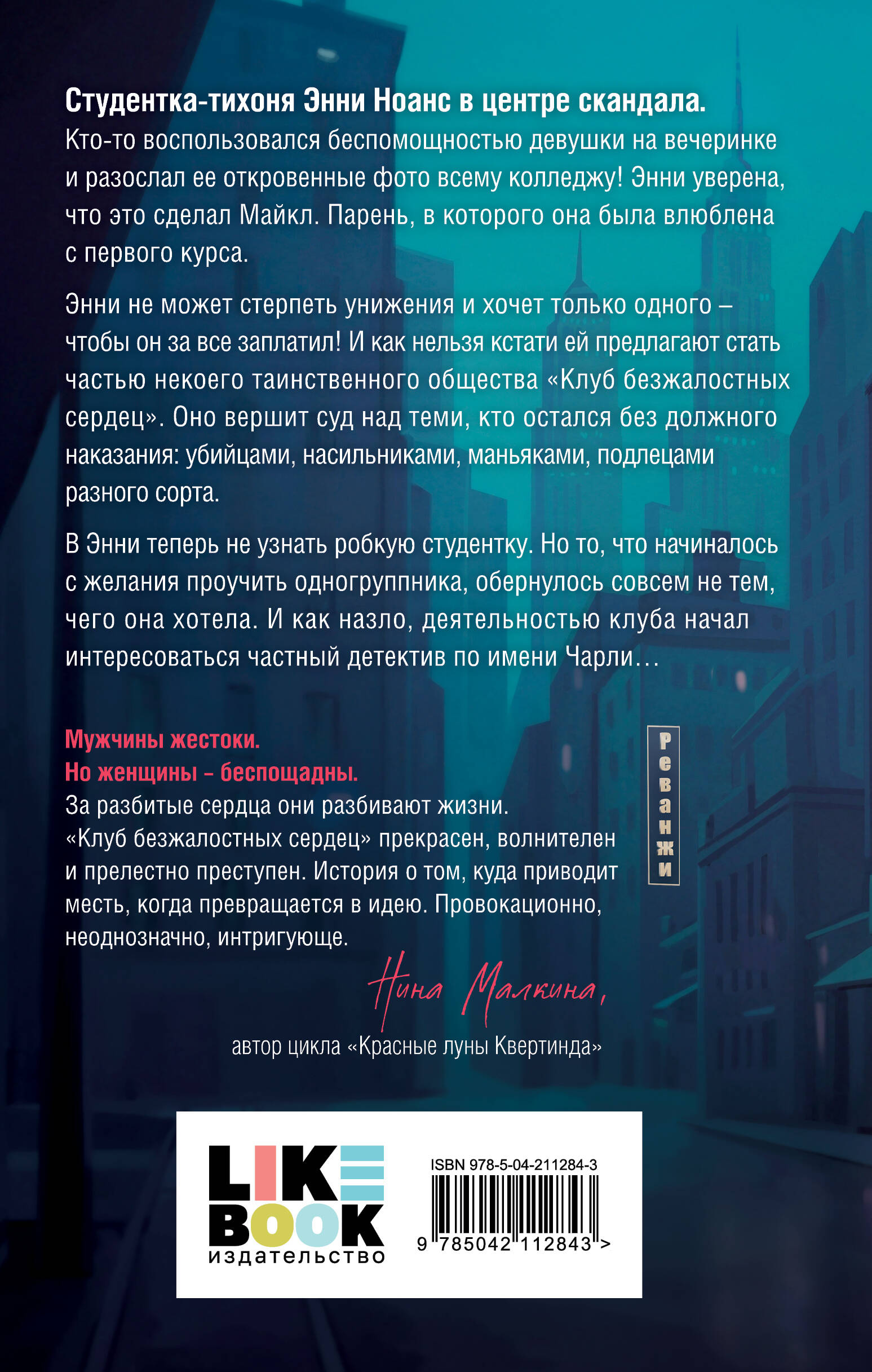 ЕСЛИ БЫ «БОЙЦОВСКИЙ КЛУБ» БЫЛ… ЖЕНСКИМ. Захватывающий триллер-детектив для любителей острых ощущений. Мрачная атмосфера небольшого американского городка. Студентка попадает в закрытый женский клуб, который хранит множество тайн. Темная изнанка студенческой жизни. Студентка-тихоня Энни Ноанс в центре скандала. Кто-то воспользовался беспомощностью девушки на вечеринке и разослал ее откровенные фото всему колледжу! Энни уверена, что это сделал Майкл. Парень, в которого она была влюблена с первого курса. Энни не может стерпеть унижения и хочет только одного - чтобы он за все заплатил! И как нельзя кстати ей предлагают стать частью некого таинственного общества «Клуб безжалостных сердец». Оно вершит суд над теми, кто остался без должного наказания - убийцы, насильники, маньяки, подлецы разного сорта. В Энни теперь не узнать робкую студентку. Но то, что начиналось с желания проучить одногруппника, обернулось совсем не тем, чего она хотела. И, как назло, деятельностью клуба начал интересоваться молодой частный детектив Чарли… Основные тропы: «хороший парень - плохая девушка», серая мораль, месть, отношения между детективом и убийцей. Идеально для поклонников «Внутри убийцы», «Безмолвного пациента», «Я плюю на ваши могилы». «Мужчины жестоки. Но женщины - беспощадны. За разбитые сердца они разбивают жизни. "Клуб безжалостных сердец" прекрасен, волнителен и прелестно преступен. История о том, куда приводит месть, когда превращается в идею. Провокационно, неоднозначно, интригующе». - Нина Малкина, автор цикла «Красные луны Квертинда» Оформление обложки GROM.