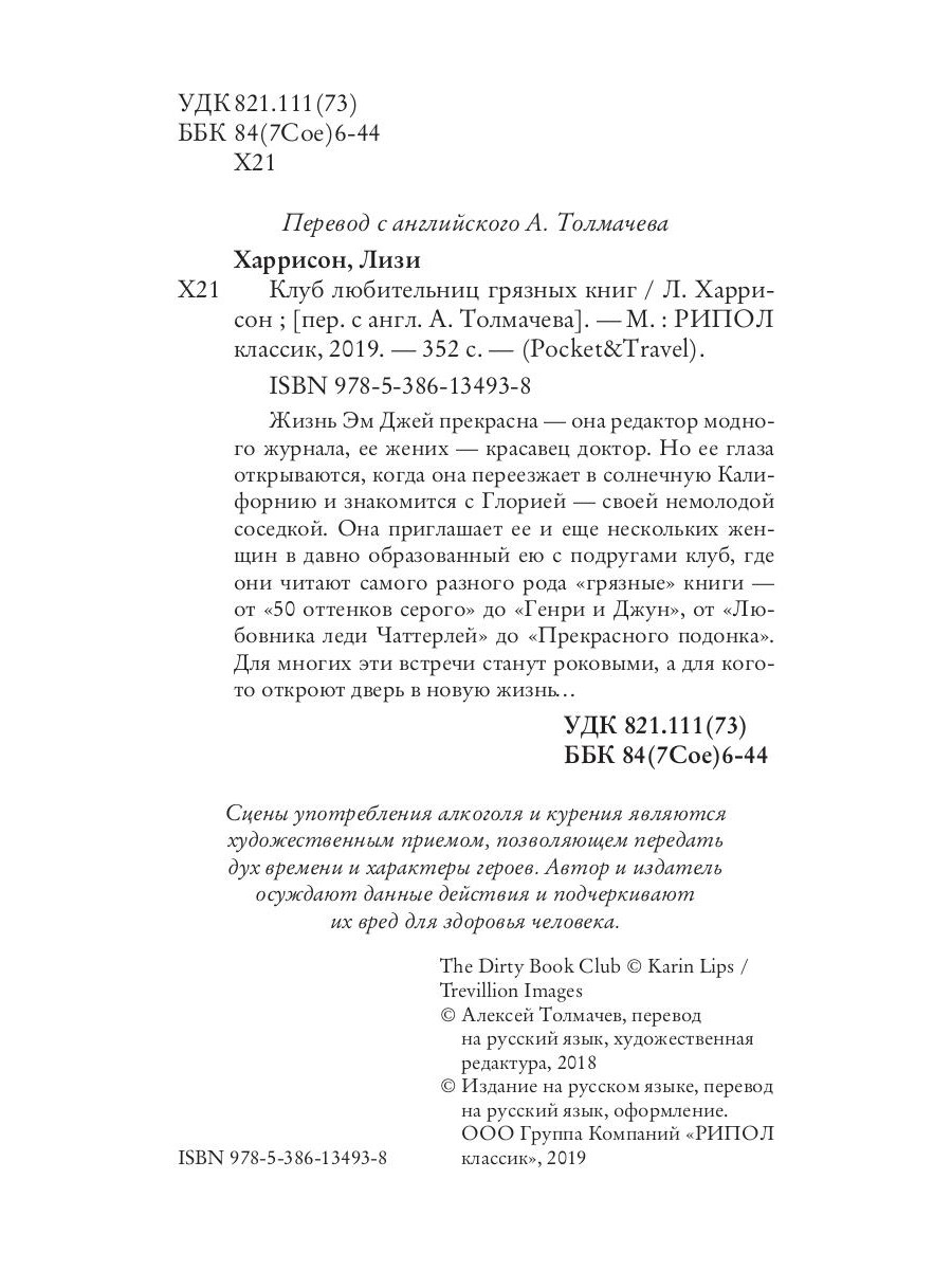 Жизнь Эм Джей прекрасна - она редактор модного журнала, ее жених - красавец доктор. Но ее глаза открываются, когда она переезжает в солнечную Калифорнию и знакомится с Глорией - своей немолодой соседкой. Она приглашает ее и еще нескольких женщин в давно образованный ею с подругами клуб, где они читают самого разного рода «грязные» книги - от «50 оттенков серого» до «Генри и Джун», от «Любовника леди Чаттерлей» до «Прекрасного подонка». Для многих эти встречи станут роковыми, а для кого-то откроют дверь в новую жизнь...| Издательство | Рипол Классик |