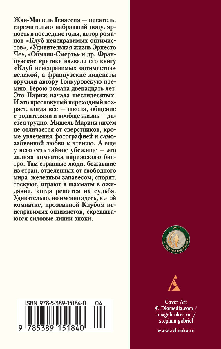 Герою романа двенадцать лет. Это Париж начала шестидесятых. И это пресловутый переходный возраст, когда все - школа, общение с родителями и вообще жизнь - дается трудно. Мишель Марини ничем не отличается от сверстников, кроме увлечения фотографией и самозабвенной любви к чтению. А еще у него есть тайное убежище - это задняя комнатка парижского бистро. Там странные люди, бежавшие из стран, отделенных от свободного мира железным занавесом, спорят, тоскуют, играют в шахматы в ожидании, когда решится их судьба. Удивительно, но именно здесь, в этой комнатке, прозванной Клубом неисправимых оптимистов, скрещиваются силовые линии эпохи.| Издательство | Азбука-Аттикус Издат.группа ООО |