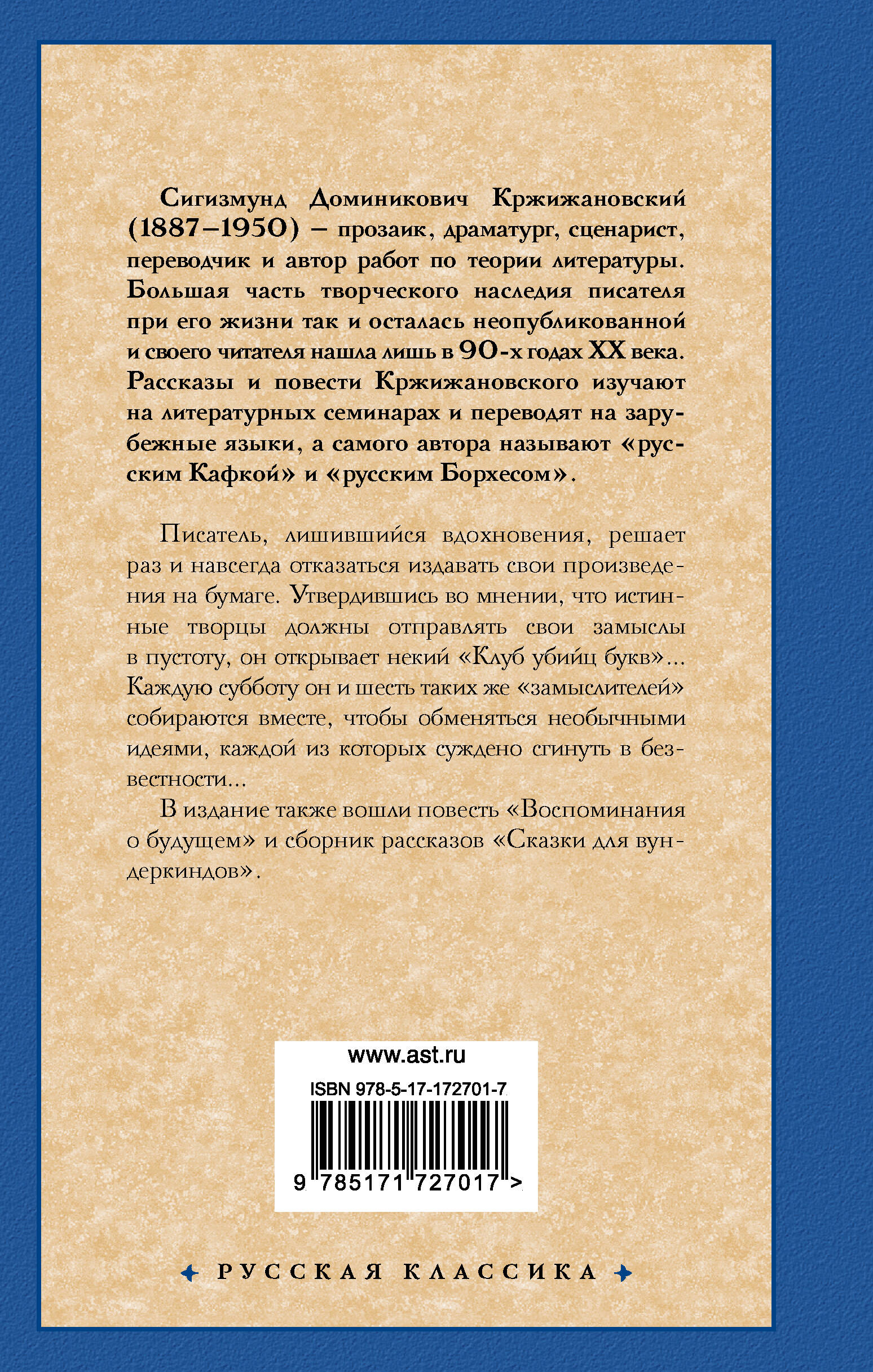 - Сигизмунд Кржижановский - советский писатель, философ и теоретик театра. Большая часть творческого наследия автора была опубликована уже после его смерти - в девяностые годы прошлого века. - В данное издание вошли сборник рассказов «Сказки для вундеркиндов», а также повести «Воспоминания о будущем» и «Клуб убийц букв». - Издание в серии «Русская классика» - в твердой обложке и классическом оформлении.| Издательство | Издательство "АСТ" |